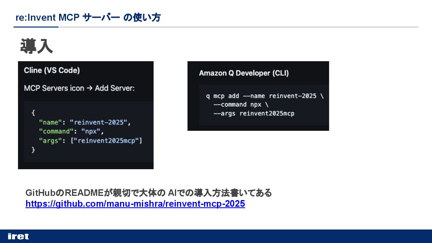 re:Invent MCP サーバー の使い方 導入 GitHubのREADMEが親切で大体の AIでの導入方法書いてある https://github.com/manu-mishra/reinvent-mcp-2025