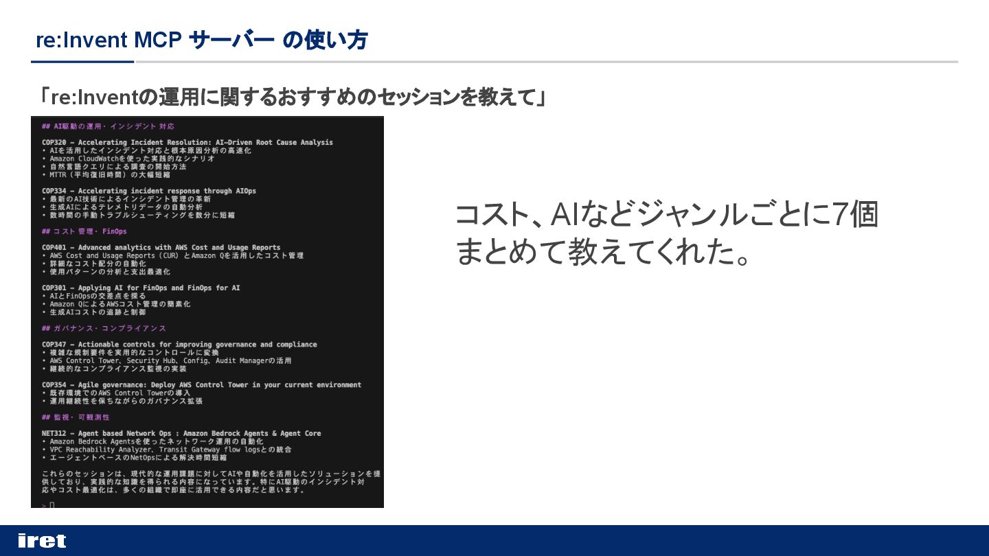 re:Invent MCP サーバー の使い方 「re:Inventの運用に関するおすすめのセッションを教えて」 コスト、AIなどジャンルごとに7個 まとめて教えてくれた。