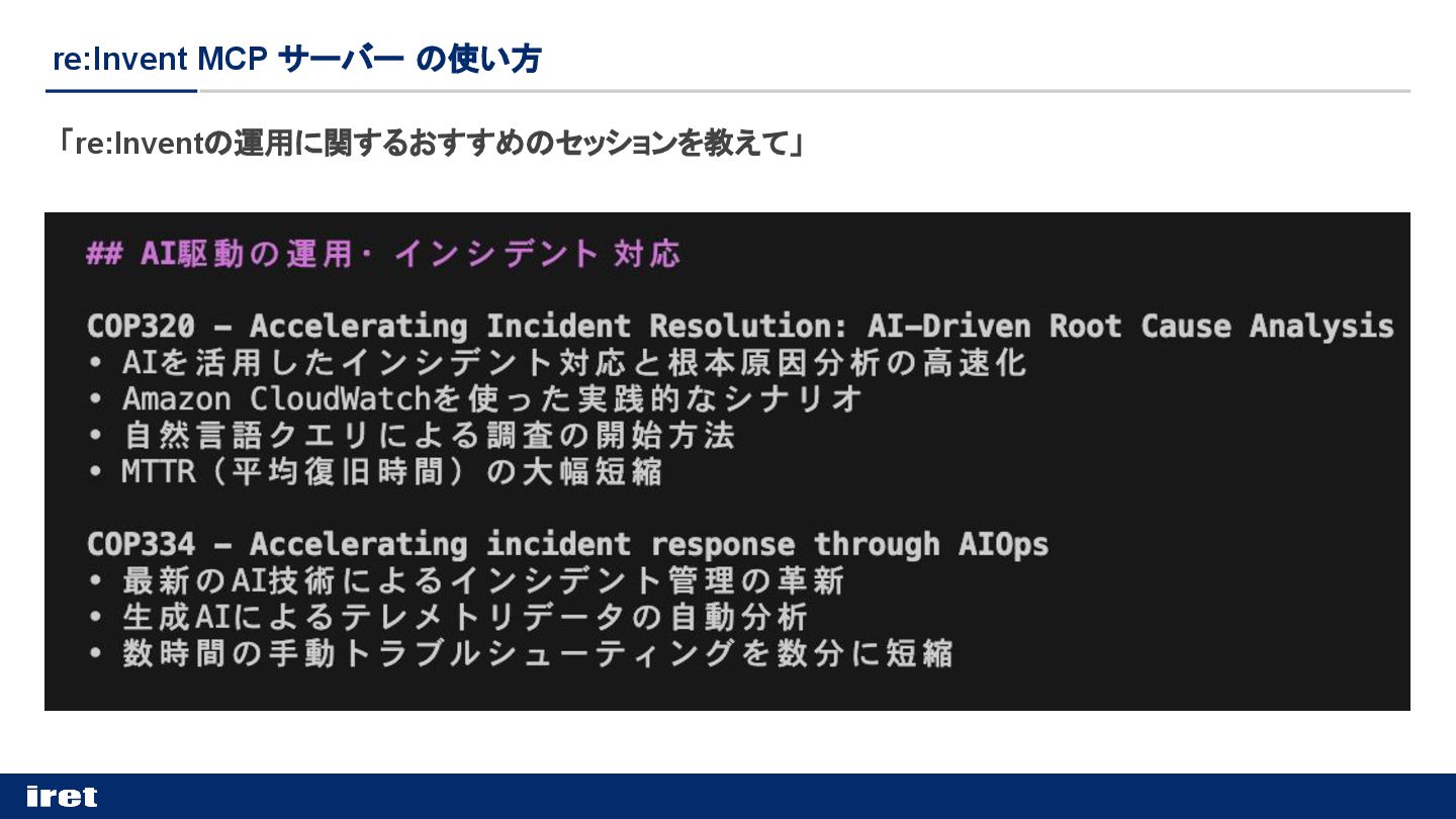 re:Invent MCP サーバー の使い方 「re:Inventの運用に関するおすすめのセッションを教えて」