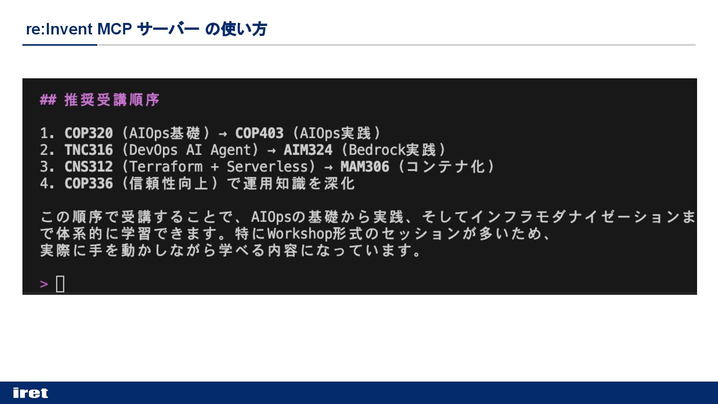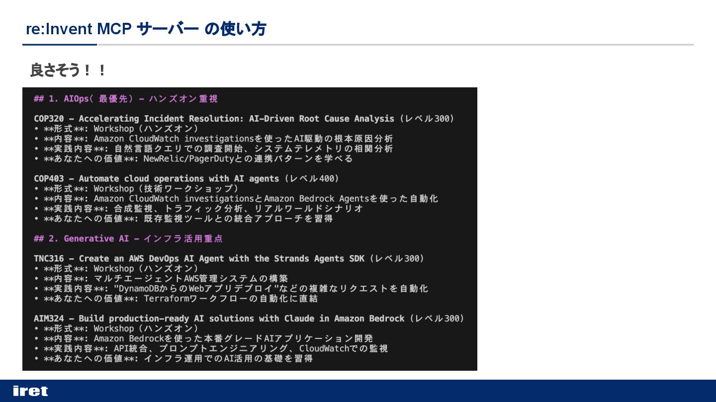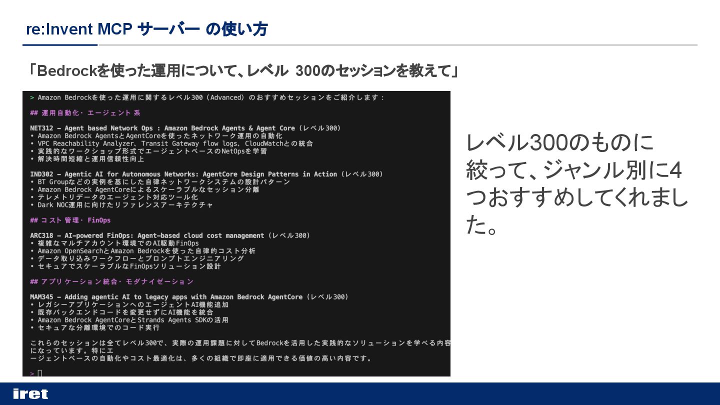 re:Invent MCP サーバー の使い方 「Bedrockを使った運用について、レベル 300のセッションを教えて」 レベル300のものに 絞って、ジャンル別に4 つおすすめしてくれまし た。