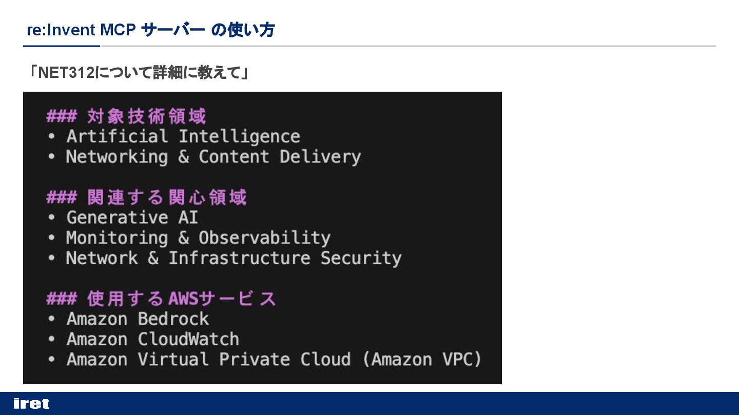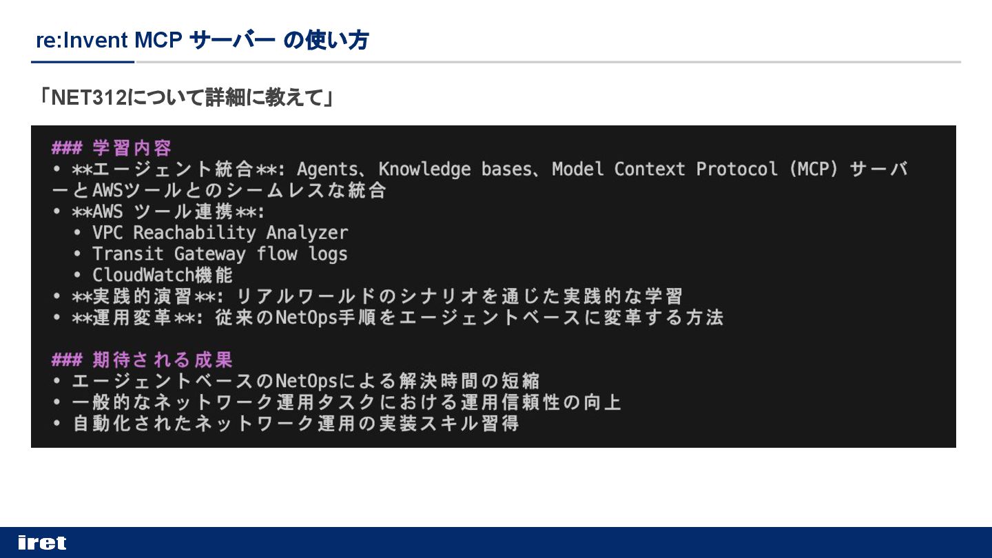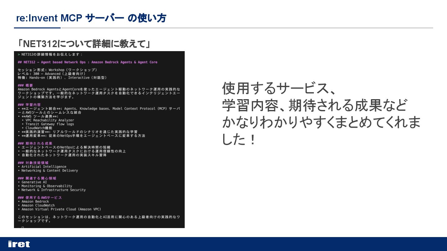 re:Invent MCP サーバー の使い方 「NET312について詳細に教えて」 使用するサービス、 学習内容、期待される成果など かなりわかりやすくまとめてくれま した!