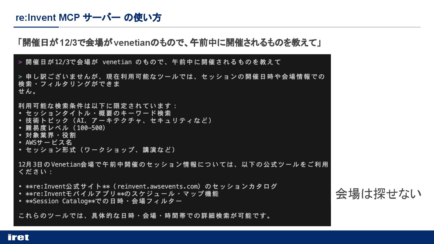 re:Invent MCP サーバー の使い方 「開催日が 12/3で会場がvenetianのもので、午前中に開催されるものを教えて」 会場は探せない