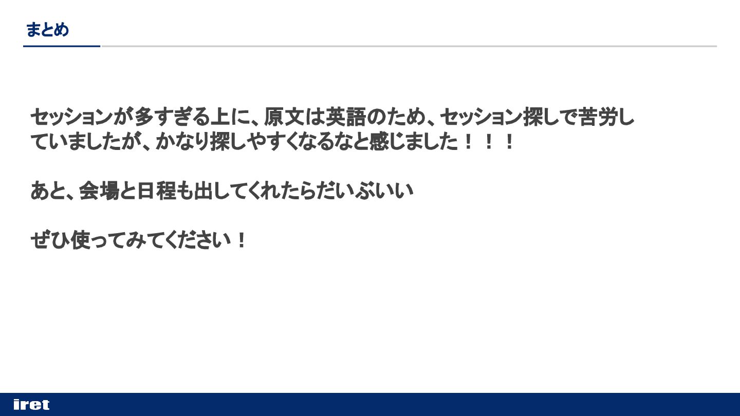まとめ セッションが多すぎる上に、原文は英語のため、セッション探しで苦労し ていましたが、かなり探しやすくなるなと感じました!!! あと、会場と日程も出してくれたらだいぶいい ぜひ使ってみてください!
