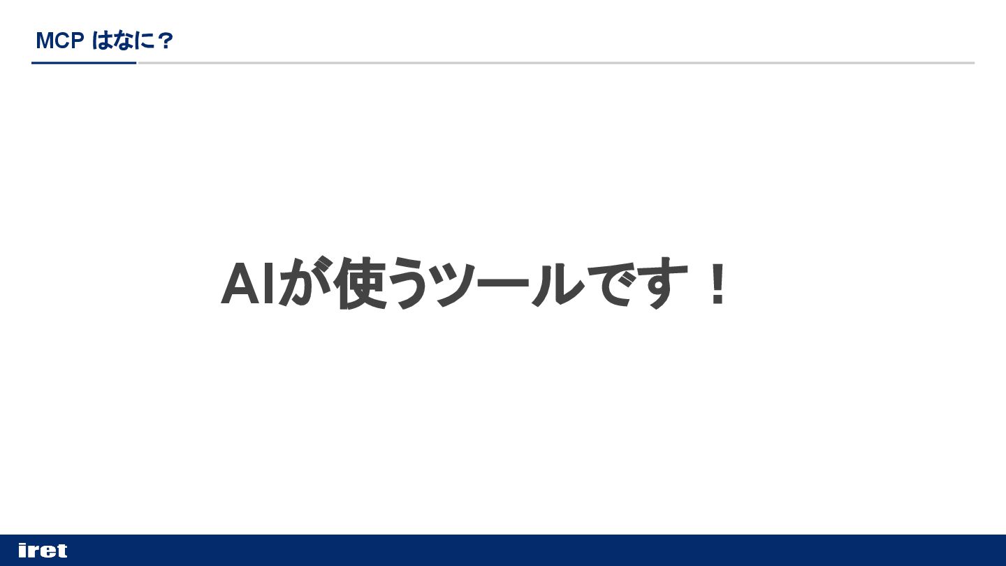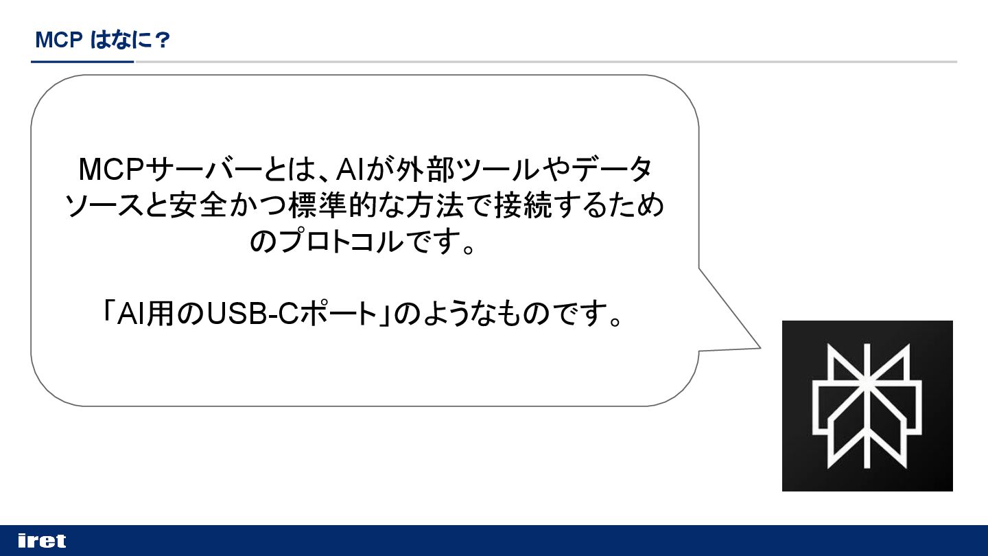 MCP はなに? MCPサーバーとは、AIが外部ツールやデータ ソースと安全かつ標準的な方法で接続するため のプロトコルです。 「AI用のUSB-Cポート」のようなものです。