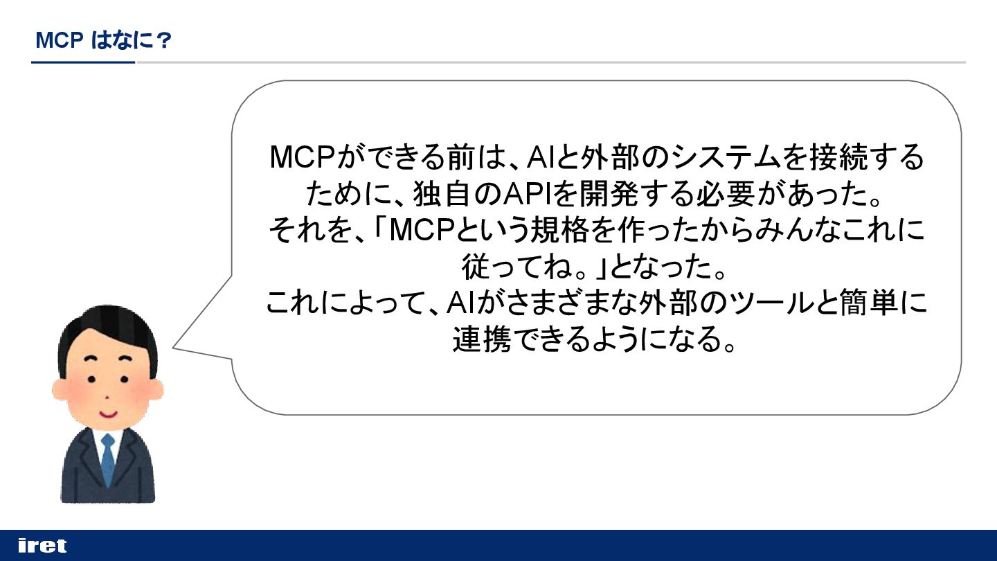 MCP はなに? MCPができる前は、AIと外部のシステムを接続する ために、独自のAPIを開発する必要があった。 それを、「MCPという規格を作ったからみんなこれに 従ってね。」となった。 これによって、AIがさまざまな外部のツールと簡単に 連携できるようになる。