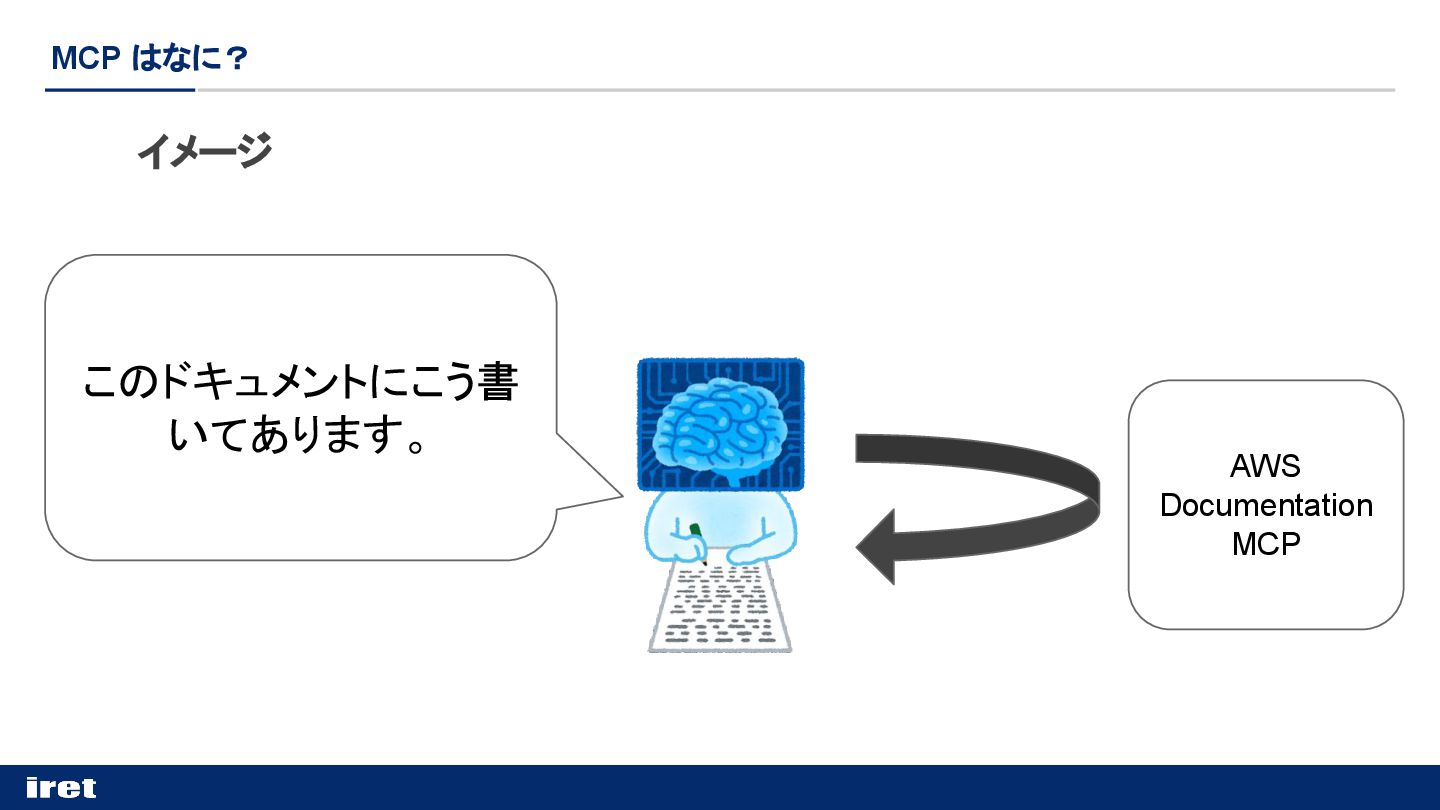 MCP はなに? このドキュメントにこう書 いてあります。 AWS Documentation MCP イメージ