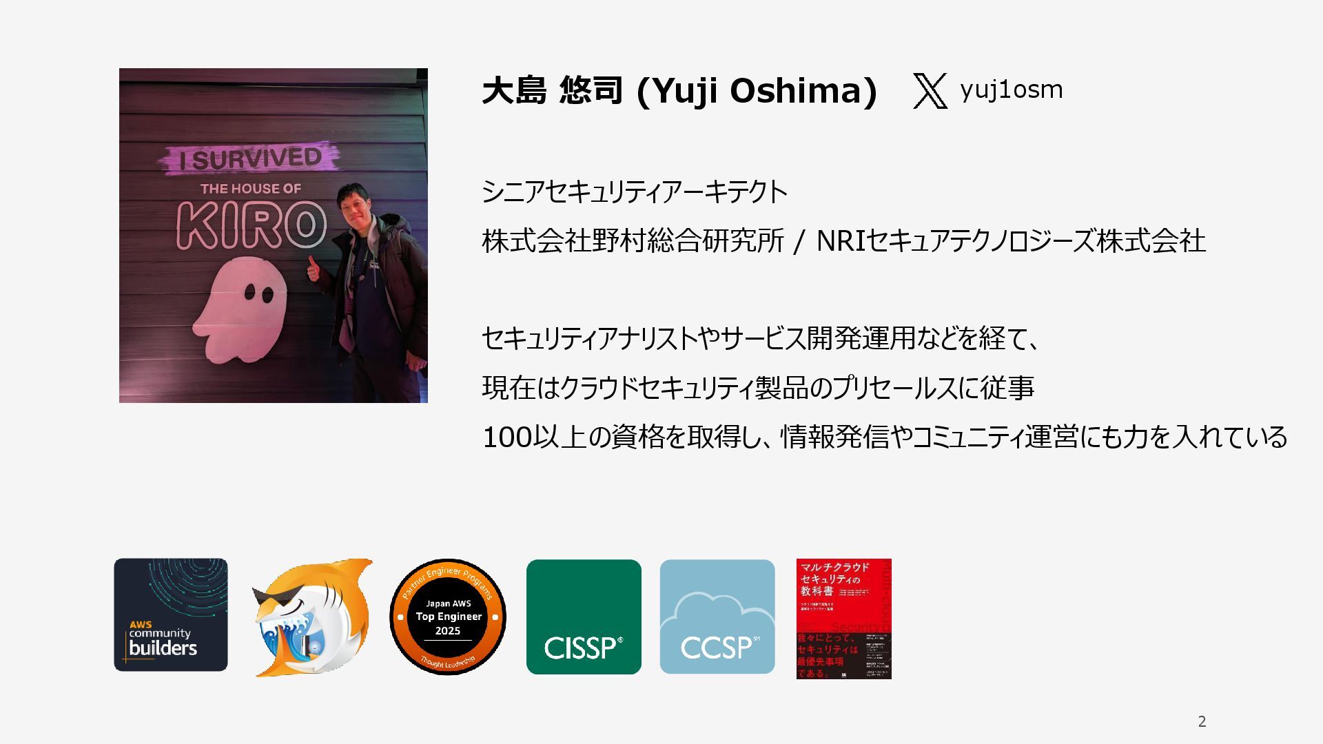 2 大島 悠司 (Yuji Oshima) シニアセキュリティアーキテクト 株式会社野村総合研究所 / NRIセキュアテクノロジーズ株式会社 セキュリティアナリストやサービス開発運用などを経て、