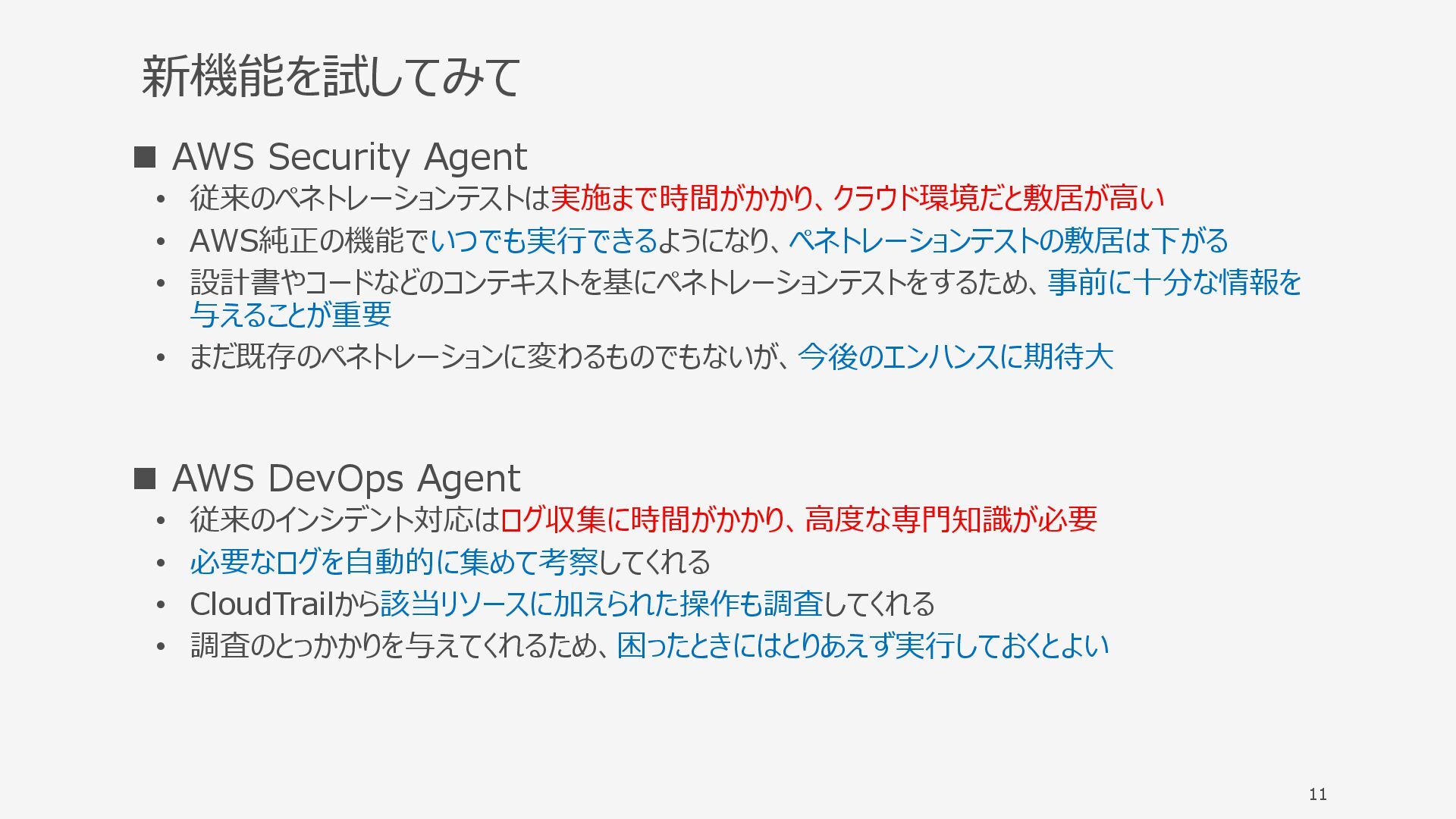 新機能を試してみて ◼ AWS Security Agent • 従来のペネトレーションテストは実施まで時間がかかり、クラウド環境だと敷居が高い • AWS純正の機能でいつでも実行できるようになり、ペネトレーションテストの敷居は下がる •