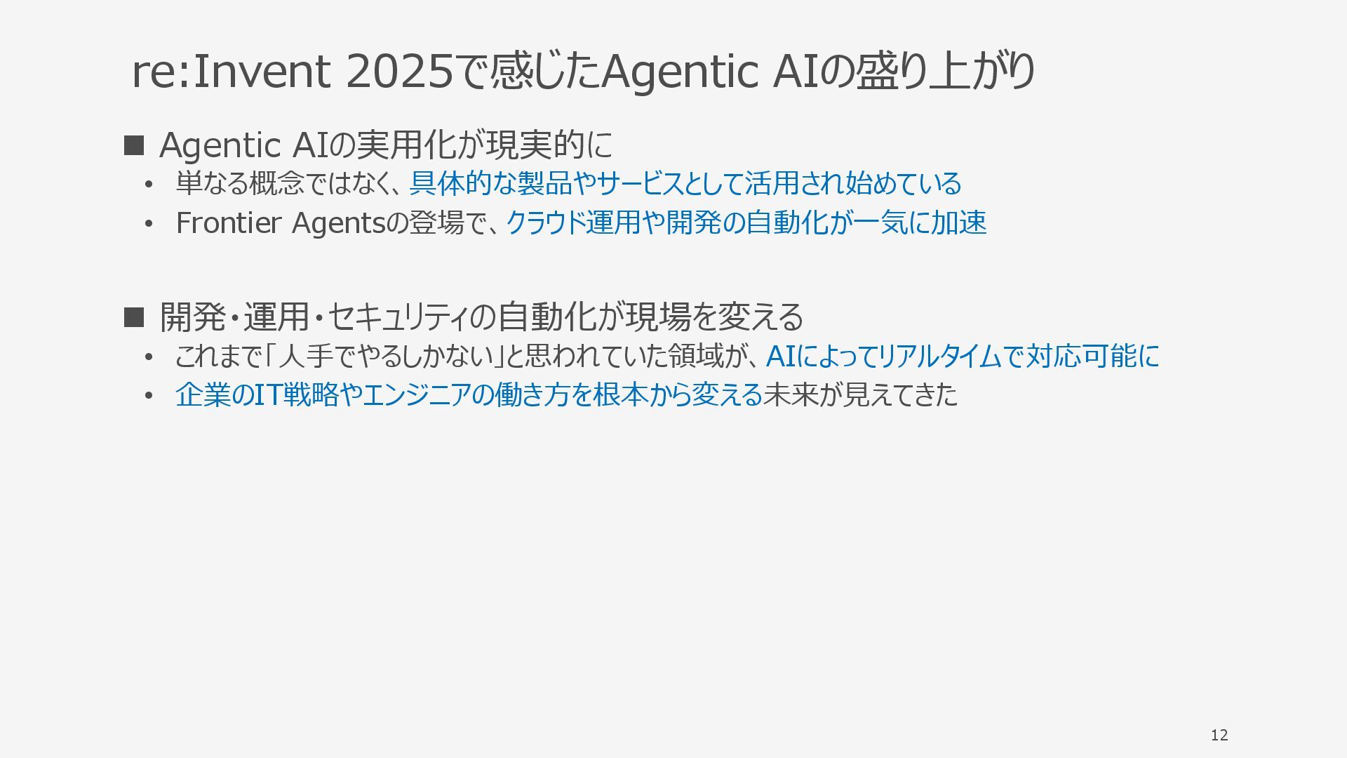 re:Invent 2025で感じたAgentic AIの盛り上がり ◼ Agentic AIの実用化が現実的に • 単なる概念ではなく、具体的な製品やサービスとして活用され始めている • Frontier