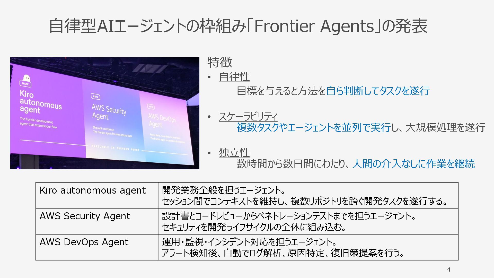 設計書とコードレビューからペネトレーションテストまでを担うエージェント。 セキュリティを開発ライフサイクルの全体に組み込む。 AWS DevOps Agent 運用・監視・インシデント対応を担うエージェント。 アラート検知後、自動でログ解析、原因特定、復旧策提案を行う。 4 特徴 • 自律性 目標を与えると方法を自ら判断してタスクを遂行 • スケーラビリティ 複数タスクやエージェントを並列で実行し、大規模処理を遂行 • 独立性 数時間から数日間にわたり、人間の介入なしに作業を継続