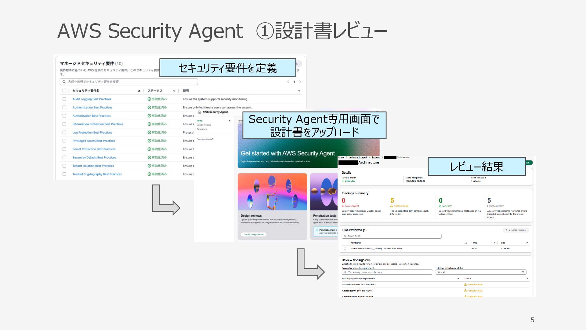 AWS Security Agent ①設計書レビュー 5 セキュリティ要件を定義 Security Agent専用画面で 設計書をアップロード レビュー結果