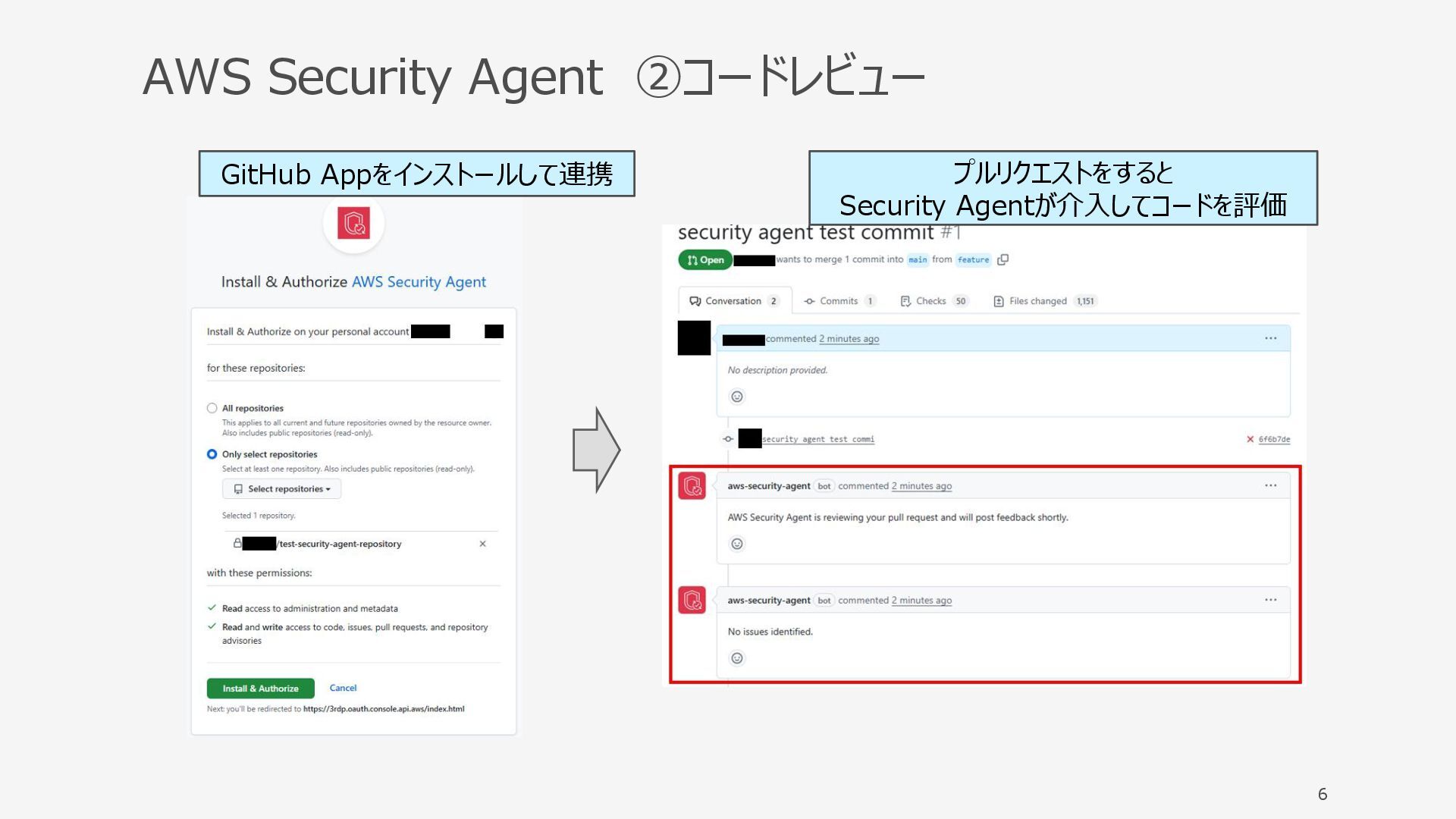 AWS Security Agent ②コードレビュー 6 GitHub Appをインストールして連携 プルリクエストをすると Security Agentが介入してコードを評価