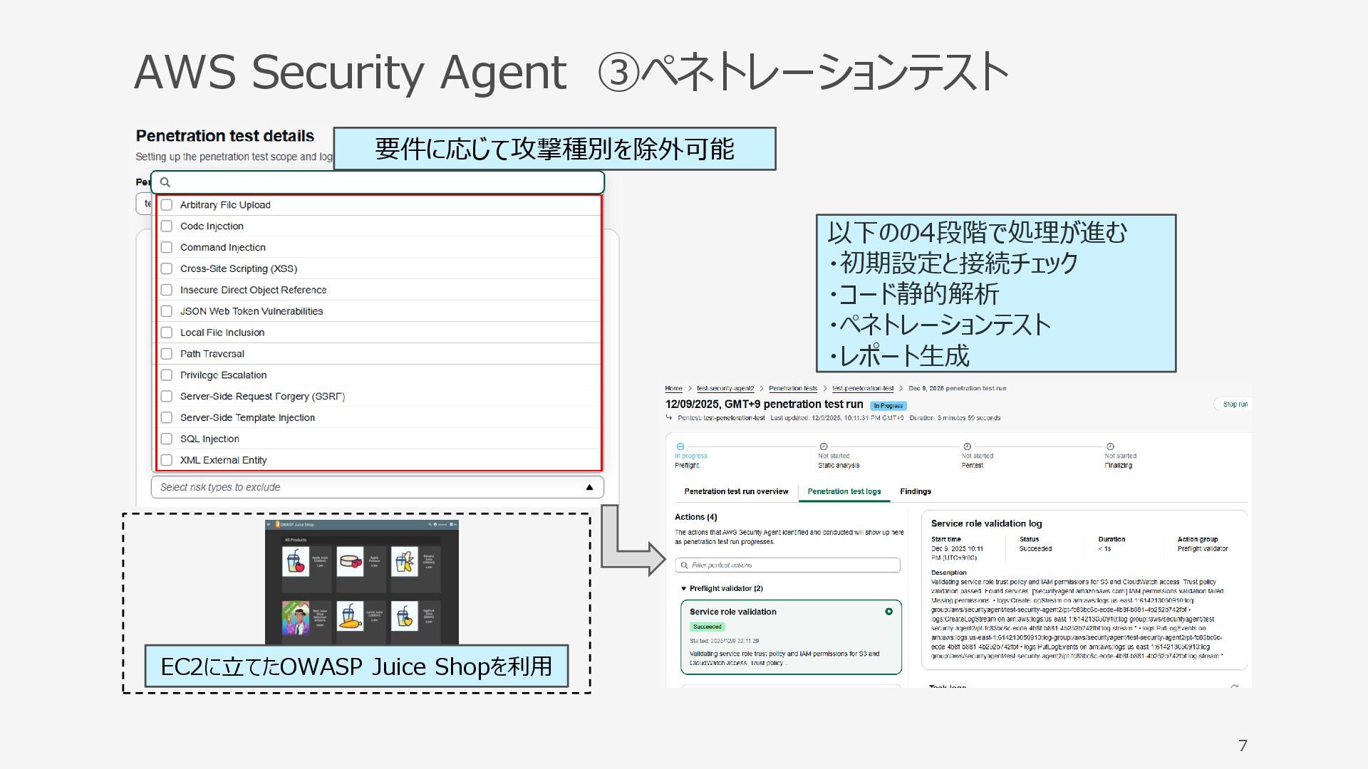 AWS Security Agent ③ペネトレーションテスト 7 要件に応じて攻撃種別を除外可能 以下のの4段階で処理が進む ・初期設定と接続チェック ・コード静的解析 ・ペネトレーションテスト