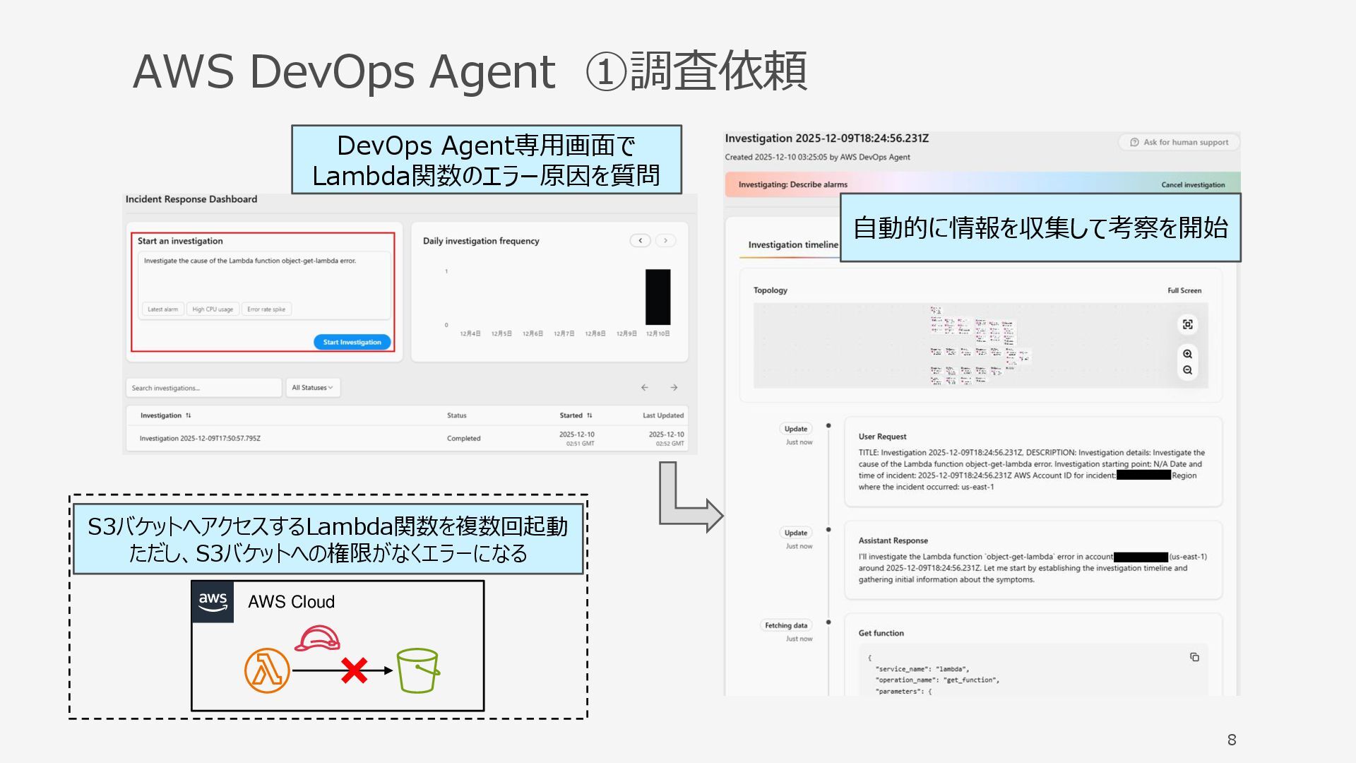 S3バケットへアクセスするLambda関数を複数回起動 ただし、S3バケットへの権限がなくエラーになる 自動的に情報を収集して考察を開始