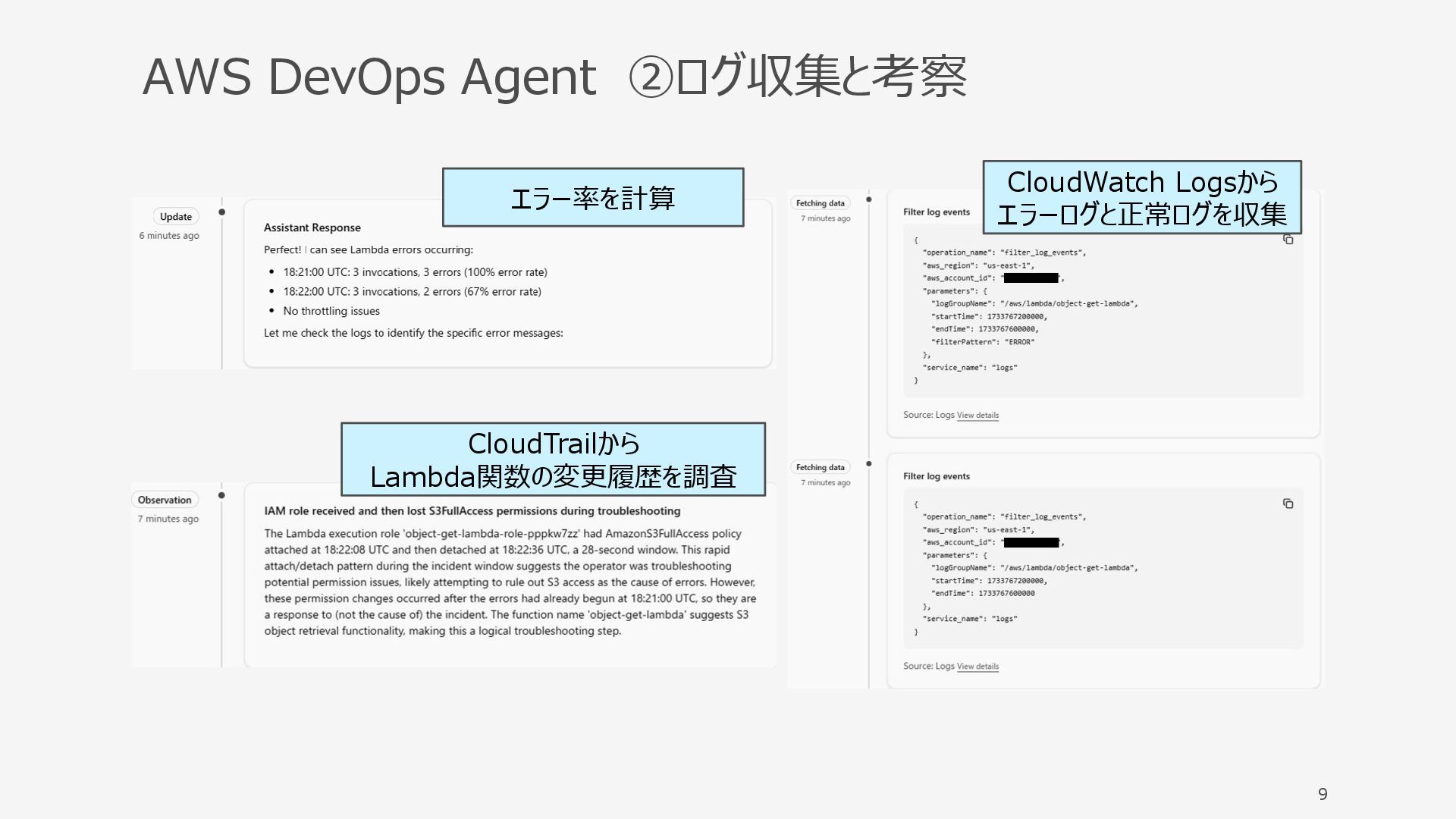 AWS DevOps Agent ②ログ収集と考察 9 エラー率を計算 CloudWatch Logsから エラーログと正常ログを収集 CloudTrailから