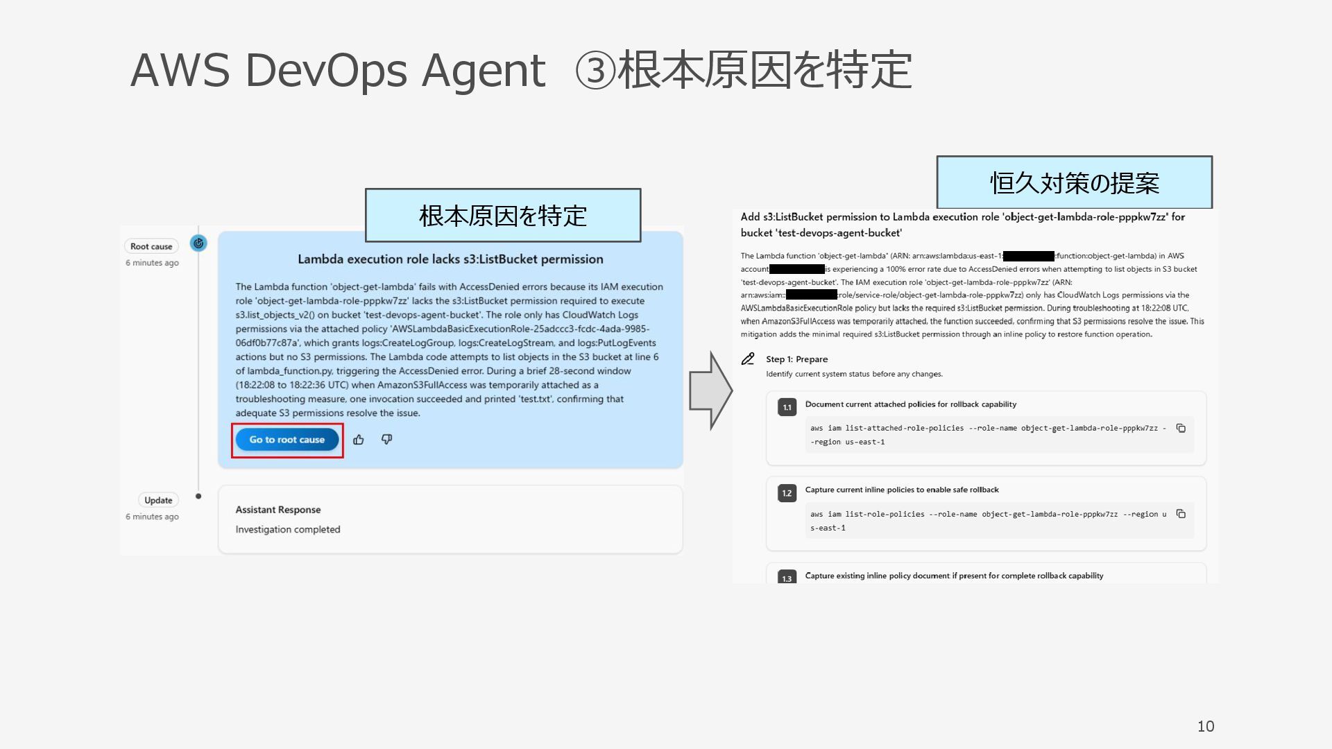 AWS DevOps Agent ③根本原因を特定 10 根本原因を特定 恒久対策の提案