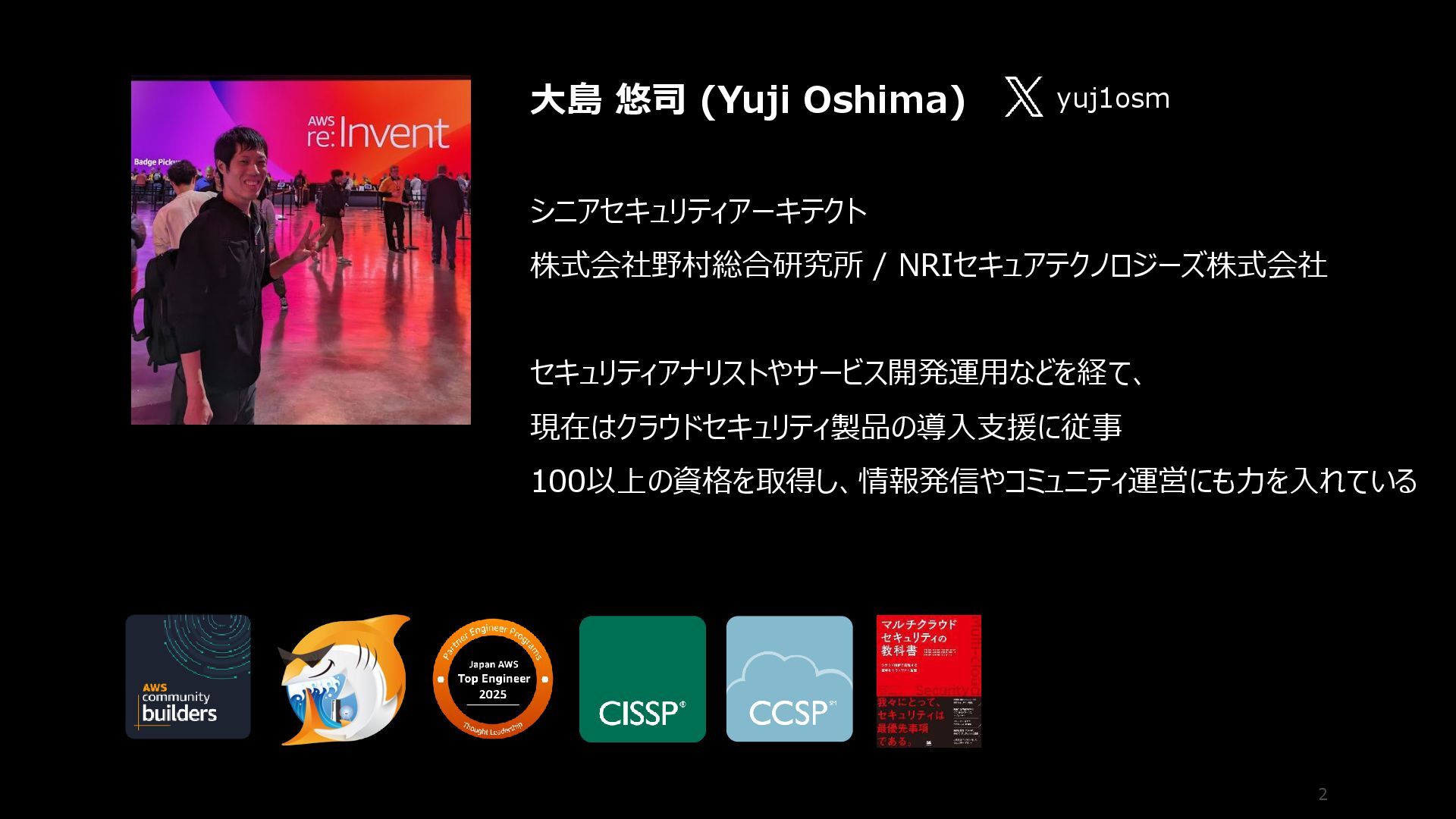 大島 悠司 (Yuji Oshima) シニアセキュリティアーキテクト 株式会社野村総合研究所 / NRIセキュアテクノロジーズ株式会社 セキュリティアナリストやサービス開発運用などを経て、 現在はクラウドセキュリティ製品の導入支援に従事