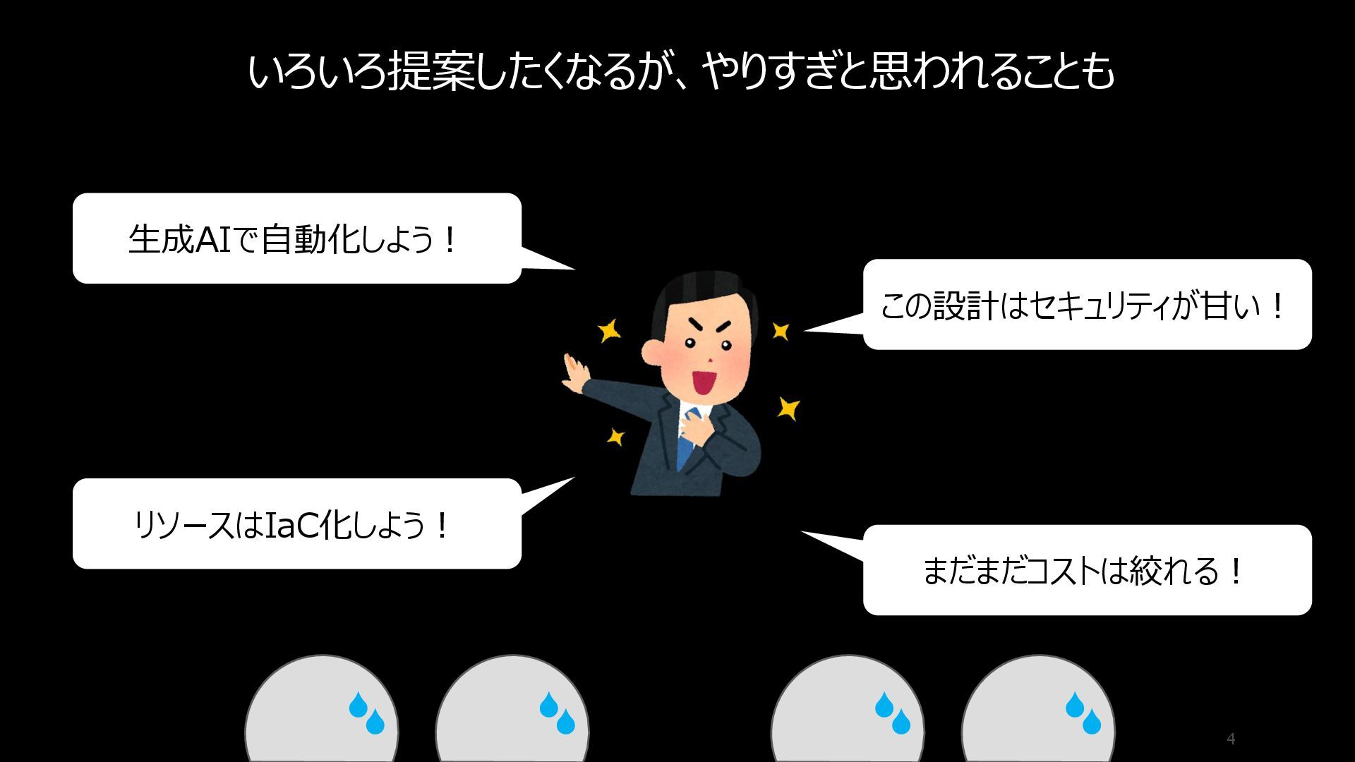 いろいろ提案したくなるが、やりすぎと思われることも 4 生成AIで自動化しよう! リソースはIaC化しよう! この設計はセキュリティが甘い! まだまだコストは絞れる!