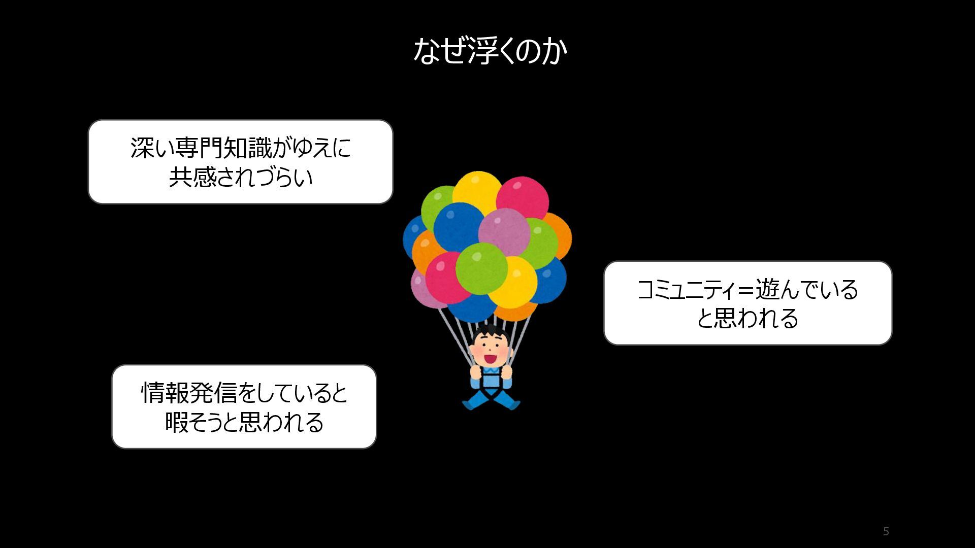 なぜ浮くのか 5 深い専門知識がゆえに 共感されづらい コミュニティ=遊んでいる と思われる 情報発信をしていると 暇そうと思われる