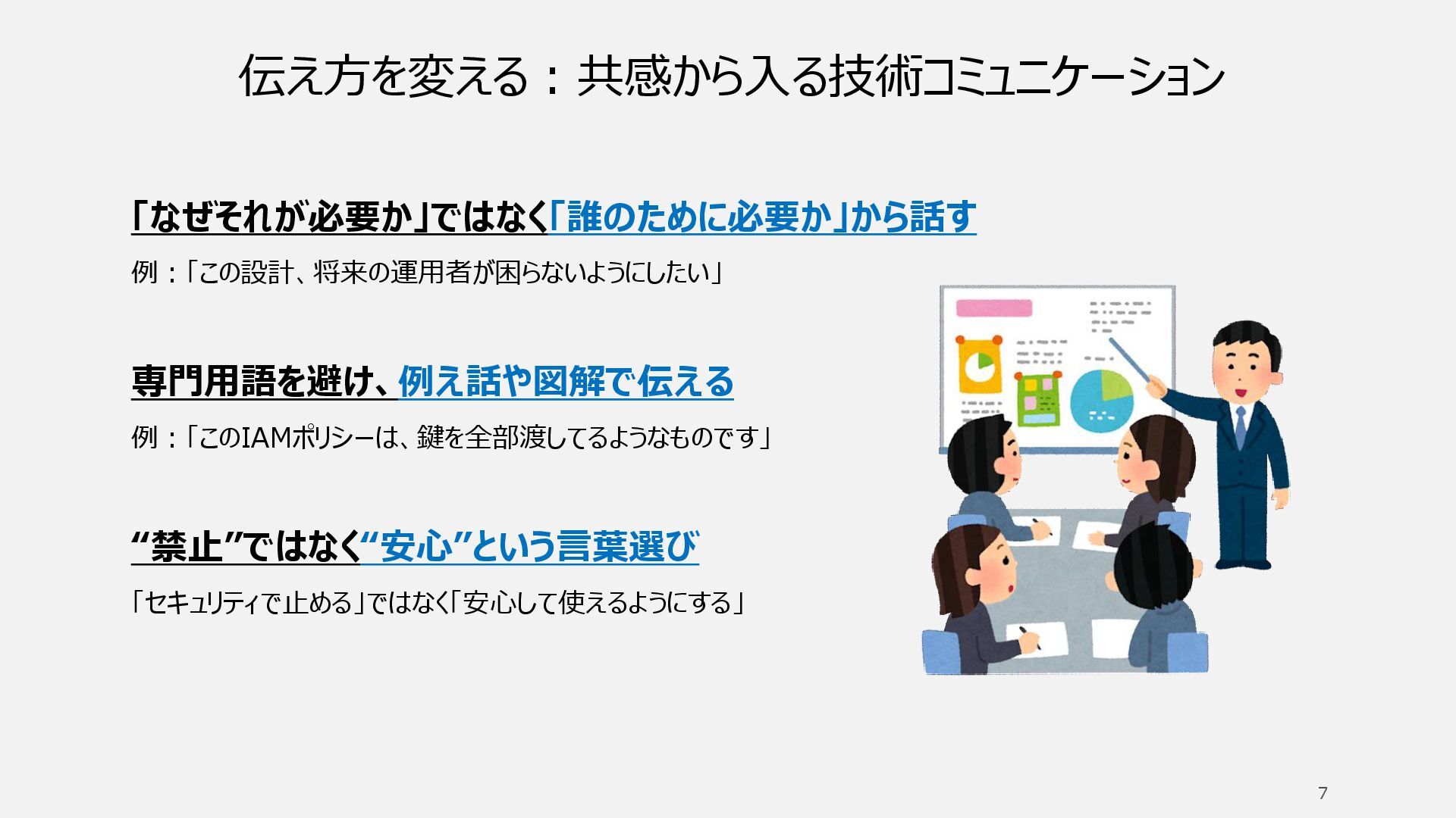 伝え方を変える:共感から入る技術コミュニケーション 「なぜそれが必要か」ではなく「誰のために必要か」から話す 例:「この設計、将来の運用者が困らないようにしたい」 専門用語を避け、例え話や図解で伝える 例:「このIAMポリシーは、鍵を全部渡してるようなものです」 “禁止”ではなく“安心”という言葉選び 「セキュリティで止める」ではなく「安心して使えるようにする」 7