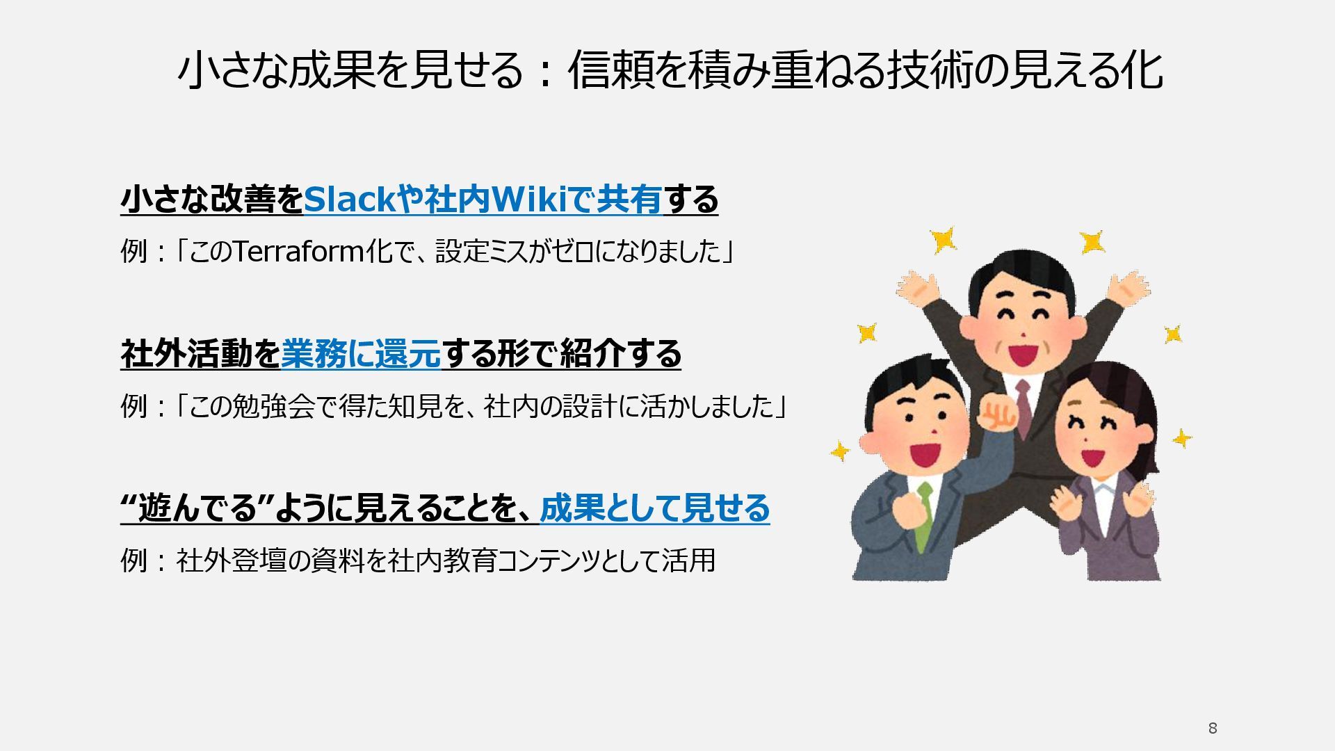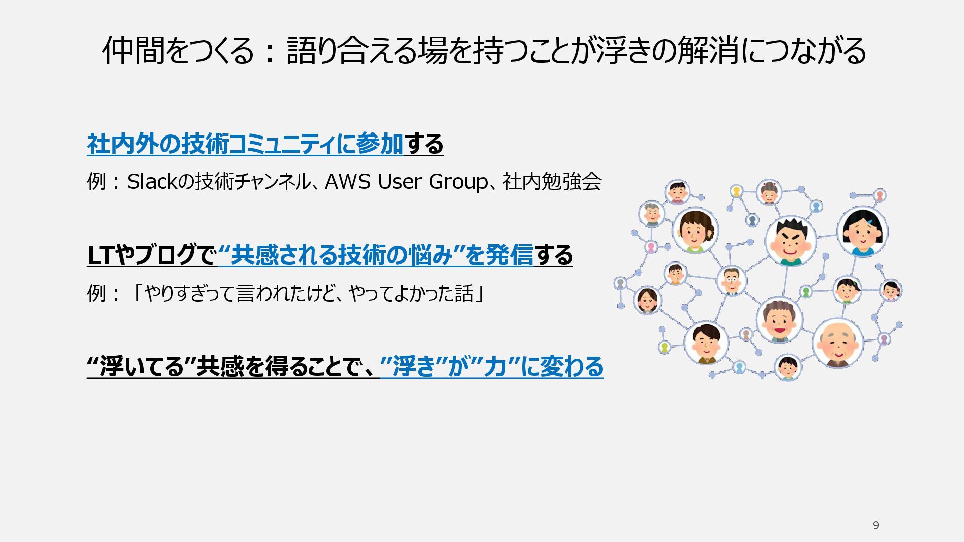 小さな成果を見せる:信頼を積み重ねる技術の見える化 小さな改善をSlackや社内Wikiで共有する 例:「このTerraform化で、設定ミスがゼロになりました」 社外活動を業務に還元する形で紹介する 例:「この勉強会で得た知見を、社内の設計に活かしました」 “遊んでる”ように見えることを、成果として見せる 例:社外登壇の資料を社内教育コンテンツとして活用 8