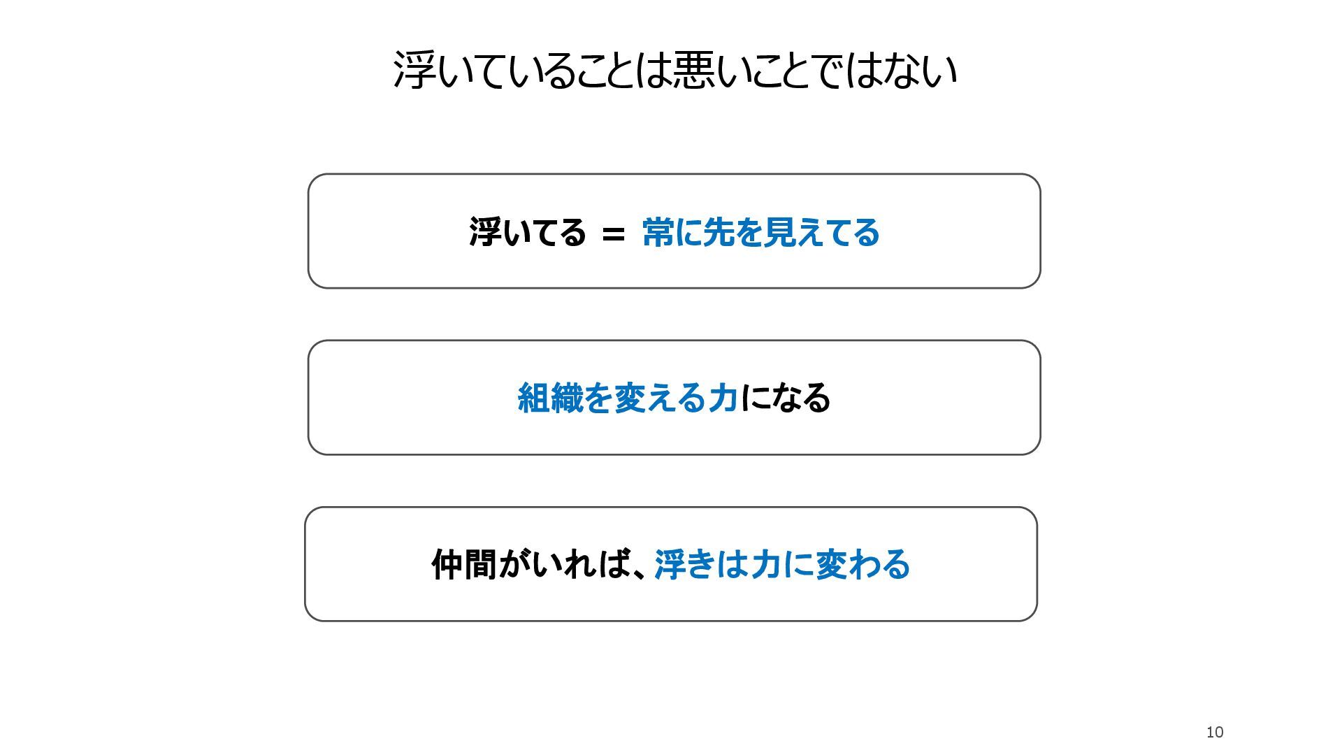 浮いていることは悪いことではない 10 浮いてる = 常に先を見えてる 組織を変える力になる 仲間がいれば、浮きは力に変わる