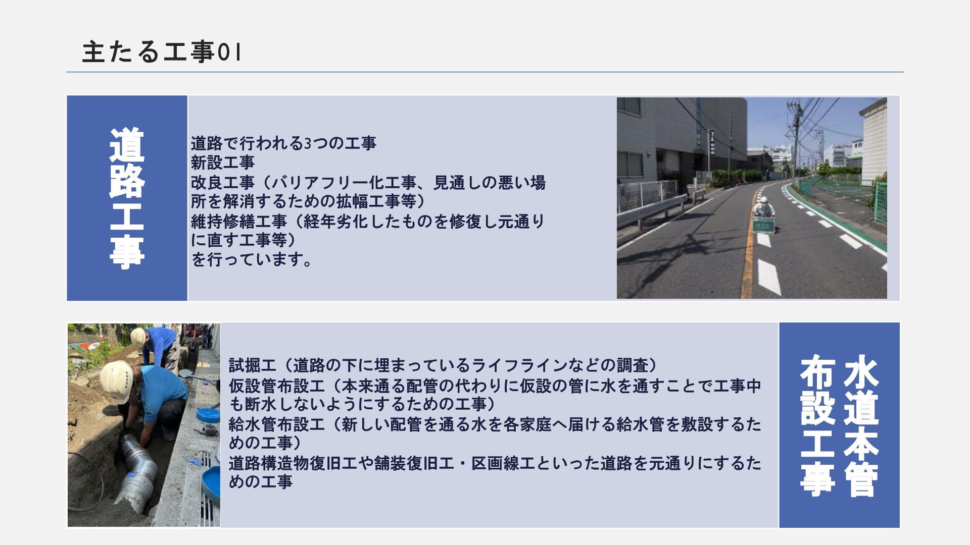 主たる工事01 道 路 工 事 道路で行われる3つの工事 新設工事 改良工事(バリアフリー化工事、見通しの悪い場 所を解消するための拡幅工事等) 維持修繕工事(経年劣化したものを修復し元通り