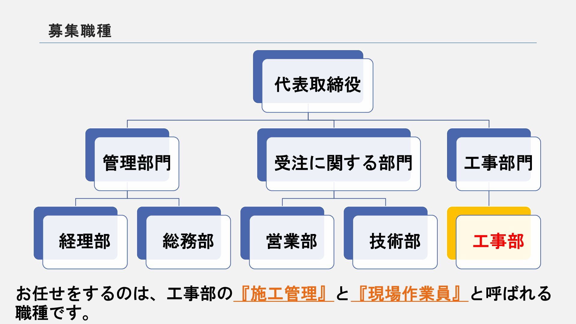 募集職種 代表取締役 管理部門 経理部 総務部 受注に関する部門 営業部 技術部 工事部門 工事部
