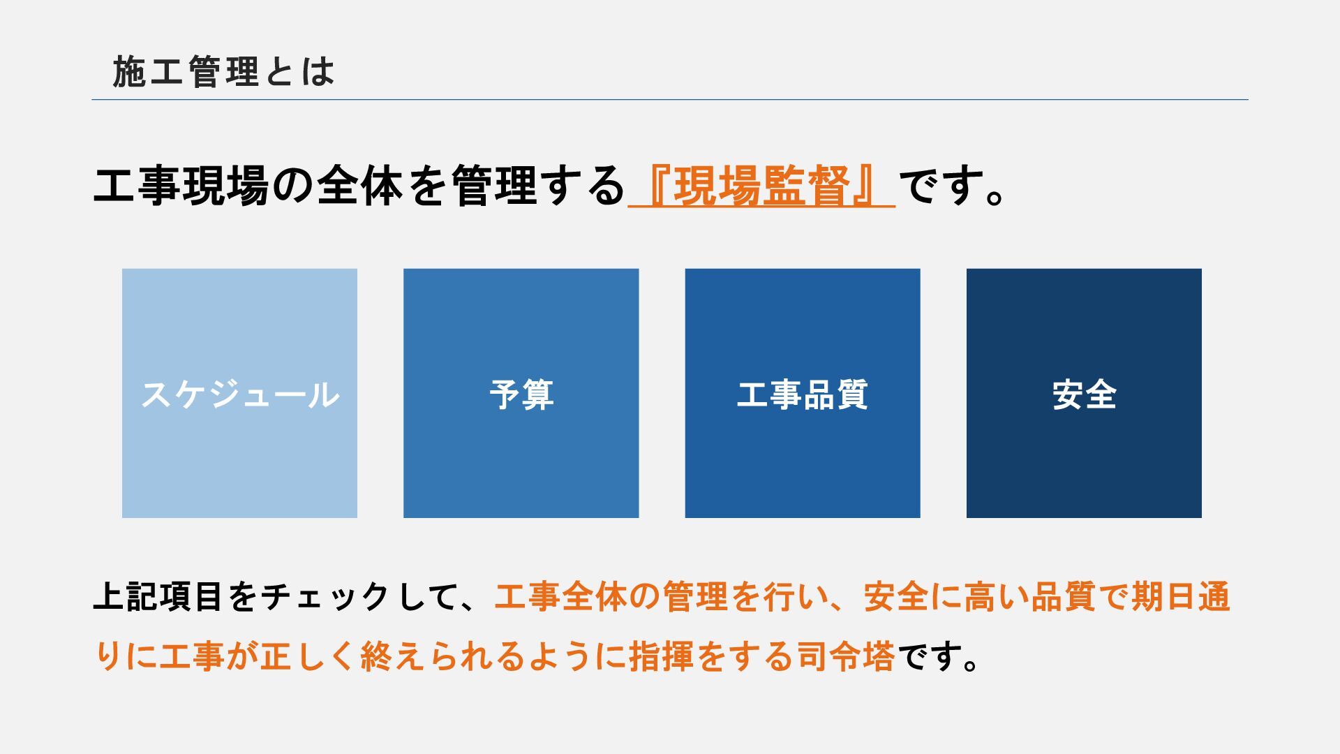 施工管理とは 工事現場の全体を管理する『現場監督』です。 スケジュール 予算 工事品質 安全 上記項目をチェックして、工事全体の管理を行い、安全に高い品質で期日通 りに工事が正しく終えられるように指揮をする司令塔です。