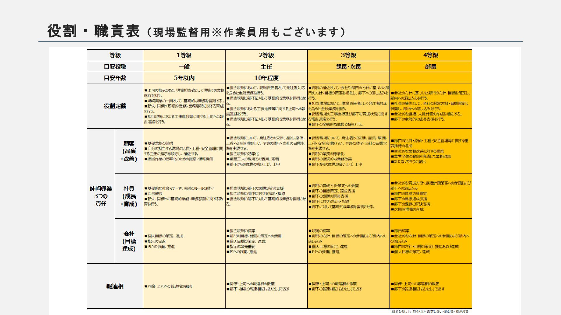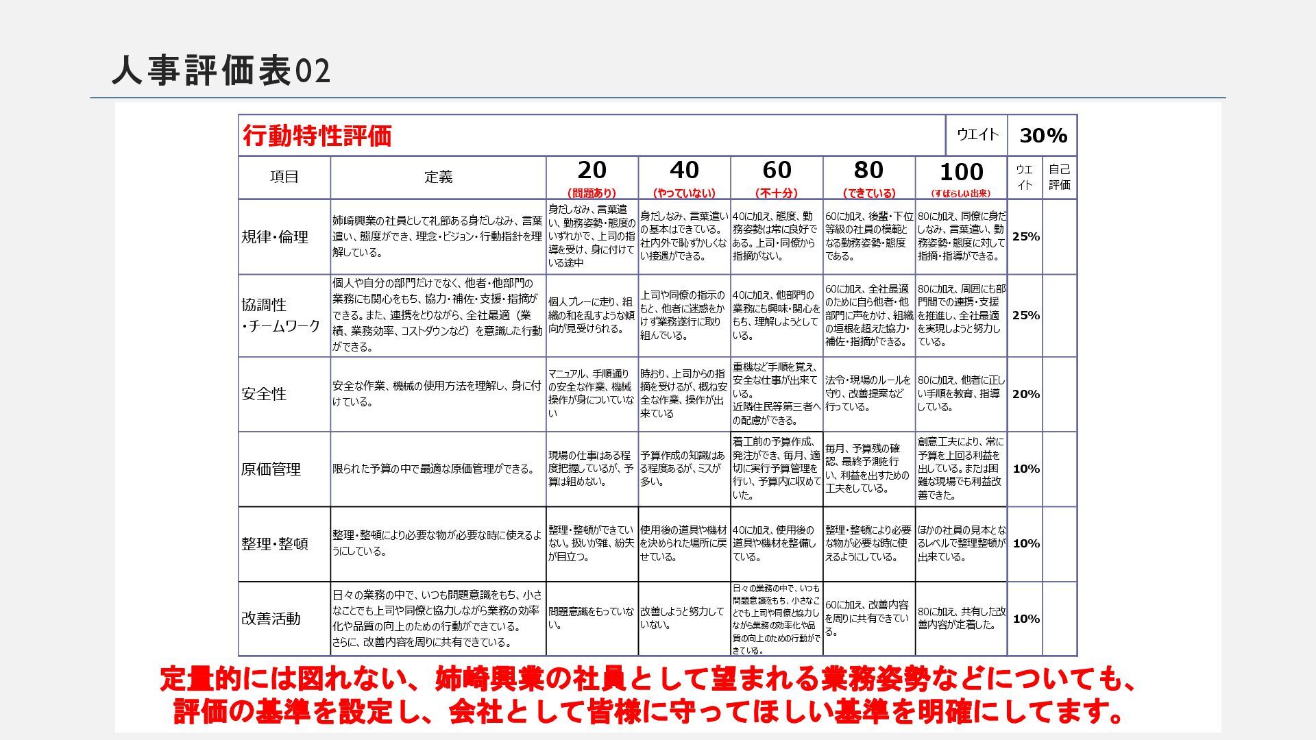 (できている) 100 (すばらしい出来) ウエ イト 行動特性評価 ウエイト 30% 自己 評価 協調性 ・チームワーク 個人や自分の部門だけでなく、他者・他部門の 業務にも関心をもち、協力・補佐・支援・指摘が できる。また、連携をとりながら、全社最適(業 績、業務効率、コストダウンなど)を意識した行動 ができる。 個人プレーに走り、組 織の和を乱すような傾 向が見受けられる。 上司や同僚の指示の もと、他者に迷惑をか けず業務遂行に取り 組んでいる。 40に加え、他部門の 業務にも興味・関心を もち、理解しようとして いる。 60に加え、全社最適 のために自ら他者・他 部門に声をかけ、組織 の垣根を超えた協力・ 補佐・指摘ができる。 80に加え、周囲にも部 門間での連携・支援 を推進し、全社最適 を実現しようと努力し ている。 25% 80に加え、同僚に身だ しなみ、言葉遣い、勤 務姿勢・態度に対して 指摘・指導ができる。 25% 規律・倫理 姉崎興業の社員として礼節ある身だしなみ、言葉 遣い、態度ができ、理念・ビジョン・行動指針を理 解している。 身だしなみ、言葉遣 い、勤務姿勢・態度の いずれかで、上司の指 導を受け、身に付けて いる途中 身だしなみ、言葉遣い の基本はできている。 社内外で恥ずかしくな い接遇ができる。 40に加え、態度、勤 務姿勢は常に良好で ある。上司・同僚から 指摘がない。 60に加え、後輩・下位 等級の社員の模範と なる勤務姿勢・態度 である。 10% 安全性 安全な作業、機械の使用方法を理解し、身に付 けている。 マニュアル、手順通り の安全な作業、機械 操作が身についていな い 時おり、上司からの指 摘を受けるが、概ね安 全な作業、操作が出 来ている 重機など手順を覚え、 安全な仕事が出来て いる。 近隣住民等第三者へ の配慮ができる。 法令・現場のルールを 守り、改善提案など 行っている。 80に加え、他者に正し い手順を教育、指導 している。 20% 原価管理 限られた予算の中で最適な原価管理ができる。 現場の仕事はある程 度把握しているが、予 算は組めない。 40に加え、使用後の 道具や機材を整備し ている。 整理・整頓により必要 な物が必要な時に使 えるようにしている。 ほかの社員の見本とな るレベルで整理整頓が 出来ている。 10% 予算作成の知識はあ る程度あるが、ミスが 多い。 着工前の予算作成、 発注ができ、毎月、適 切に実行予算管理を 行い、予算内に収めて いた。 毎月、予算残の確 認、最終予測を行 い、利益を出すための 工夫をしている。 創意工夫により、常に 予算を上回る利益を 出している。または困 難な現場でも利益改 善できた。 改善活動 日々の業務の中で、いつも問題意識をもち、小さ なことでも上司や同僚と協力しながら業務の効率 化や品質の向上のための行動ができている。 さらに、改善内容を周りに共有できている。 問題意識をもっていな い。 改善しようと努力して いない。 日々の業務の中で、いつも 問題意識をもち、小さなこ とでも上司や同僚と協力し ながら業務の効率化や品 質の向上のための行動がで きている。 60に加え、改善内容 を周りに共有できてい る。 80に加え、共有した改 善内容が定着した。 10% 整理・整頓 整理・整頓により必要な物が必要な時に使えるよ うにしている。 整理・整頓ができてい ない。扱いが雑、紛失 が目立つ。 使用後の道具や機材 を決められた場所に戻 せている。 定量的には図れない、姉崎興業の社員として望まれる業務姿勢などについても、 評価の基準を設定し、会社として皆様に守ってほしい基準を明確にしてます。