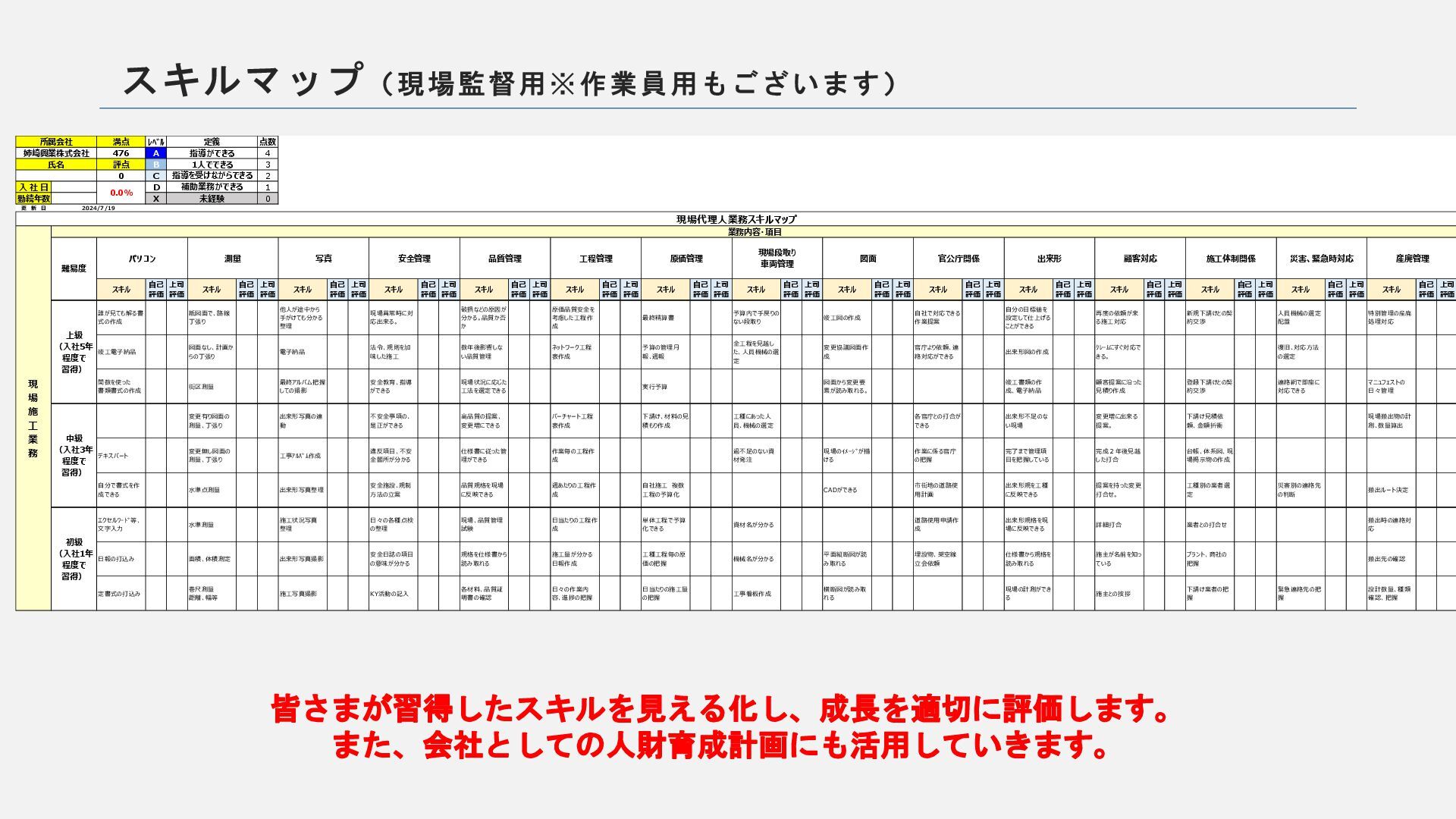 0 C 2 入 社 日 D 1 勤続年数 X 0 更 新 日 スキル 自己 評価 上司 評価 スキル 自己 評価 上司 評価 スキル 自己 評価 上司 評価 スキル 自己 評価 上司 評価 スキル 自己 評価 上司 評価 スキル 自己 評価 上司 評価 スキル 自己 評価 上司 評価 スキル 自己 評価 上司 評価 スキル 自己 評価 上司 評価 スキル 自己 評価 上司 評価 スキル 自己 評価 上司 評価 スキル 自己 評価 上司 評価 スキル 自己 評価 上司 評価 スキル 自己 評価 上司 評価 スキル 自己 評価 上司 評価 誰が見ても解る書 式の作成 紙図面で、路線 丁張り 他人が途中から 手がけても分かる 整理 現場異常時に対 応出来る。 破損などの原因が 分かる。品質か否 か 原価品質安全を 考慮した工程作 成 最終精算書 予算内で手戻りの ない段取り 竣工図の作成 自社で対応できる 作業提案 自分の目標値を 設定して仕上げる ことができる 再度の依頼が来 る施工対応 新規下請けとの契 約交渉 人員機械の選定 配置 特別管理の産廃 処理対応 竣工電子納品 図面なし、計画か らの丁張り 電子納品 法令、規則を加 味した施工 数年後影響しな い品質管理 ネットワーク工程 表作成 予算の管理月 報、週報 全工程を見越し た、人員機械の選 定 変更協議図面作 成 官庁より依頼、連 絡対応ができる 出来形図の作成 クレームにすぐ対応で きる。 復旧、対応方法 の選定 関数を使った 書類書式の作成 街区測量 最終アルバム把握 しての撮影 安全教育、指導 ができる 現場状況に応じた 工法を選定できる 実行予算 図面から変更要 素が読み取れる。 竣工書類の作 成、電子納品 顧客提案に沿った 見積り作成 登録下請けとの契 約交渉 連絡網で即座に 対応できる マニュフェストの 日々管理 変更有り図面の 測量、丁張り 出来形写真の連 動 不安全事項の、 是正ができる 高品質の提案、 変更増にできる バーチャート工程 表作成 下請け、材料の見 積もり作成 工種にあった人 員、機械の選定 各官庁との打合が できる 出来形不足のな い現場 変更増に出来る 提案。 下請け見積依 頼、金額折衝 現場搬出物の計 測、数量算出 デキスパート 変更無し図面の 測量、丁張り 工事アルバム作成 違反項目、不安 全箇所が分かる 仕様書に従った管 理ができる 作業毎の工程作 成 過不足のない資 材発注 現場のイメージが描 ける 作業に係る官庁 の把握 完了まで管理項 目を把握している 完成2年後見越 した打合 台帳、体系図、現 場掲示物の作成 自分で書式を作 成できる 水準点測量 出来形写真整理 安全施設、規制 方法の立案 品質規格を現場 に反映できる 週あたりの工程作 成 自社施工 複数 工程の予算化 CADができる 市街地の道路使 用計画 出来形規を工種 に反映できる 提案を持った変更 打合せ。 工種別の業者選 定 災害別の連絡先 の判断 搬出ルート決定 エクセルワード等、 文字入力 水準測量 施工状況写真 整理 日々の各種点検 の整理 現場、品質管理 試験 日当たりの工程作 成 単体工程で予算 化できる 資材名が分かる 道路使用申請作 成 出来形規格を現 場に反映できる 詳細打合 業者との打合せ 搬出時の連絡対 応 日報の打込み 面積、体積測定 出来形写真撮影 安全日誌の項目 の意味が分かる 規格を仕様書から 読み取れる 施工量が分かる 日報作成 工種工程毎の原 価の把握 機械名が分かる 平面縦断図が読 み取れる 埋設物、架空線 立会依頼 仕様書から規格を 読み取れる 施主が名前を知っ ている プラント、商社の 把握 搬出先の確認 定書式の打込み 巻尺測量 距離、幅等 施工写真撮影 KY活動の記入 各材料、品質証 明書の確認 日々の作業内 容、進捗の把握 日当たりの施工量 の把握 工事看板作成 横断図が読み取 れる 現場の計測ができ る 施主との挨拶 下請け業者の把 握 緊急連絡先の把 握 設計数量、種類 確認、把握 2024/7/19 所属会社 定義 姉崎興業株式会社 指導ができる 氏名 1人でできる 指導を受けながらできる 0.0% 補助業務ができる 未経験 現場代理人業務スキルマップ 現 場 施 工 業 務 業務内容・項目 難易度 パソコン 測量 写真 安全管理 品質管理 工程管理 初級 (入社1年 程度で 習得) 原価管理 現場段取り 車両管理 図面 官公庁関係 施工体制関係 災害、緊急時対応 産廃管理 上級 (入社5年 程度で 習得) 中級 (入社3年 程度で 習得) 出来形 顧客対応 皆さまが習得したスキルを見える化し、成長を適切に評価します。 また、会社としての人財育成計画にも活用していきます。