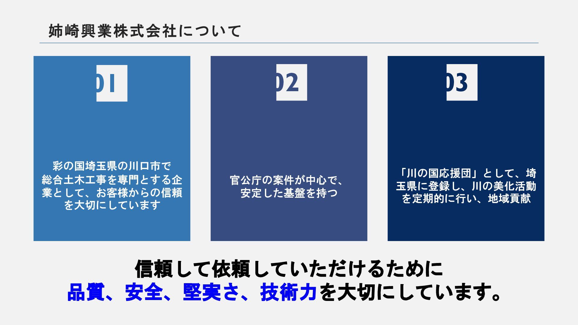 姉崎興業株式会社について 01 02 03 彩の国埼玉県の川口市で 総合土木工事を専門とする企 業として、お客様からの信頼 を大切にしています 官公庁の案件が中心で、 安定した基盤を持つ