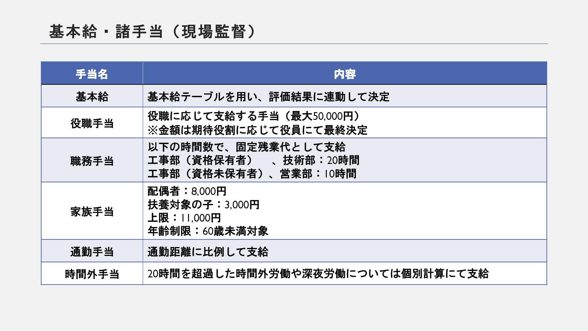 基本給・諸手当(現場監督) 手当名 内容 基本給 基本給テーブルを用い、評価結果に連動して決定 役職手当 役職に応じて支給する手当(最大50,000円) ※金額は期待役割に応じて役員にて最終決定 職務手当 以下の時間数で、固定残業代として支給