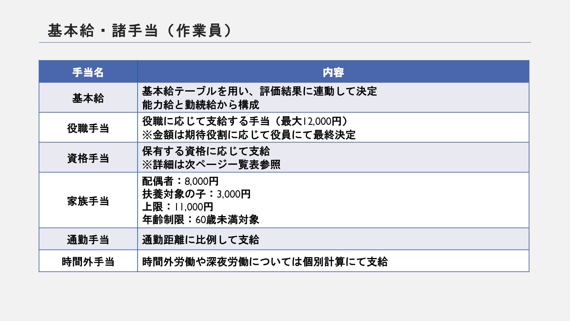 基本給・諸手当(作業員) 手当名 内容 基本給 基本給テーブルを用い、評価結果に連動して決定 能力給と勤続給から構成 役職手当 役職に応じて支給する手当(最大12,000円) ※金額は期待役割に応じて役員にて最終決定 資格手当