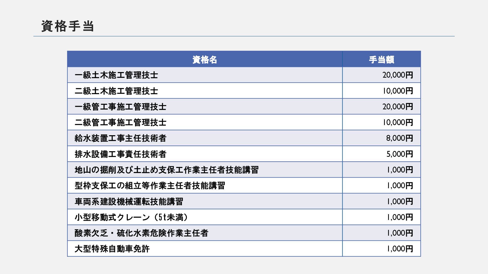 資格手当 資格名 手当額 一級土木施工管理技士 20,000円 二級土木施工管理技士 10,000円 一級管工事施工管理技士 20,000円 二級管工事施工管理技士
