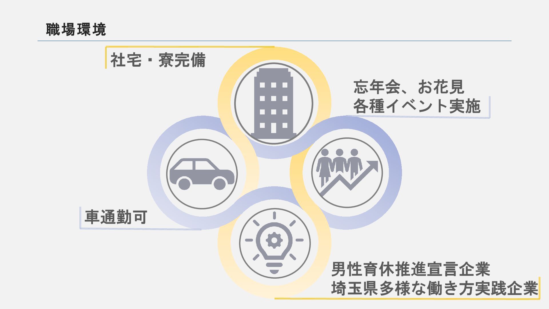 職場環境 社宅・寮完備 男性育休推進宣言企業 埼玉県多様な働き方実践企業 車通勤可 忘年会、お花見 各種イベント実施