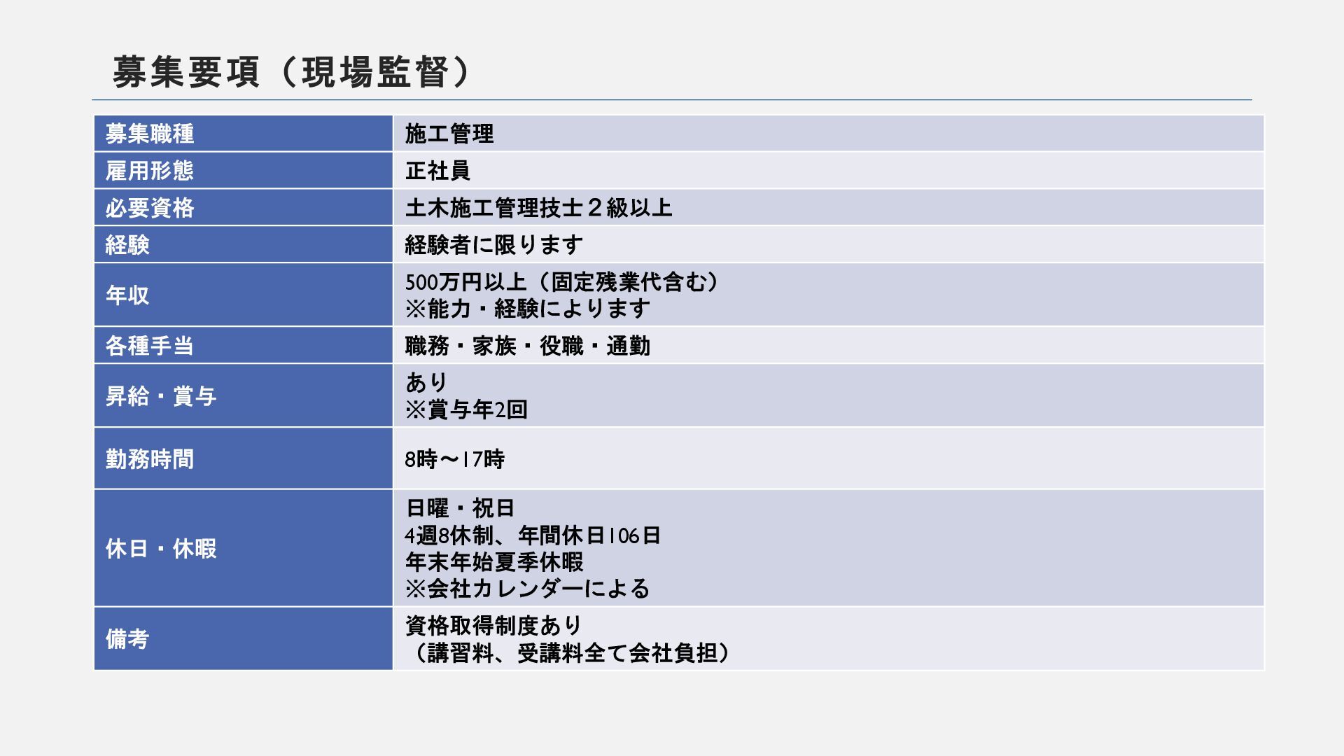 募集要項(現場監督) 募集職種 施工管理 雇用形態 正社員 必要資格 土木施工管理技士2級以上 経験 経験者に限ります 年収