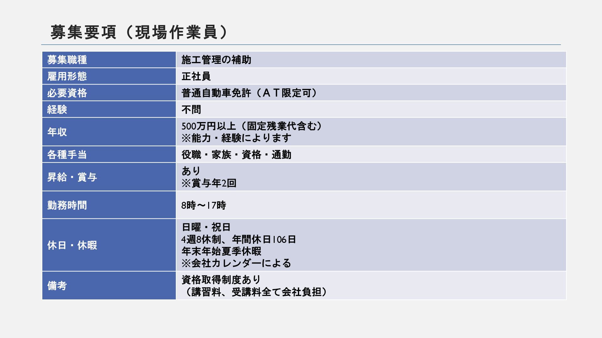 募集要項(現場作業員) 募集職種 施工管理の補助 雇用形態 正社員 必要資格 普通自動車免許(AT限定可) 経験 不問 年収