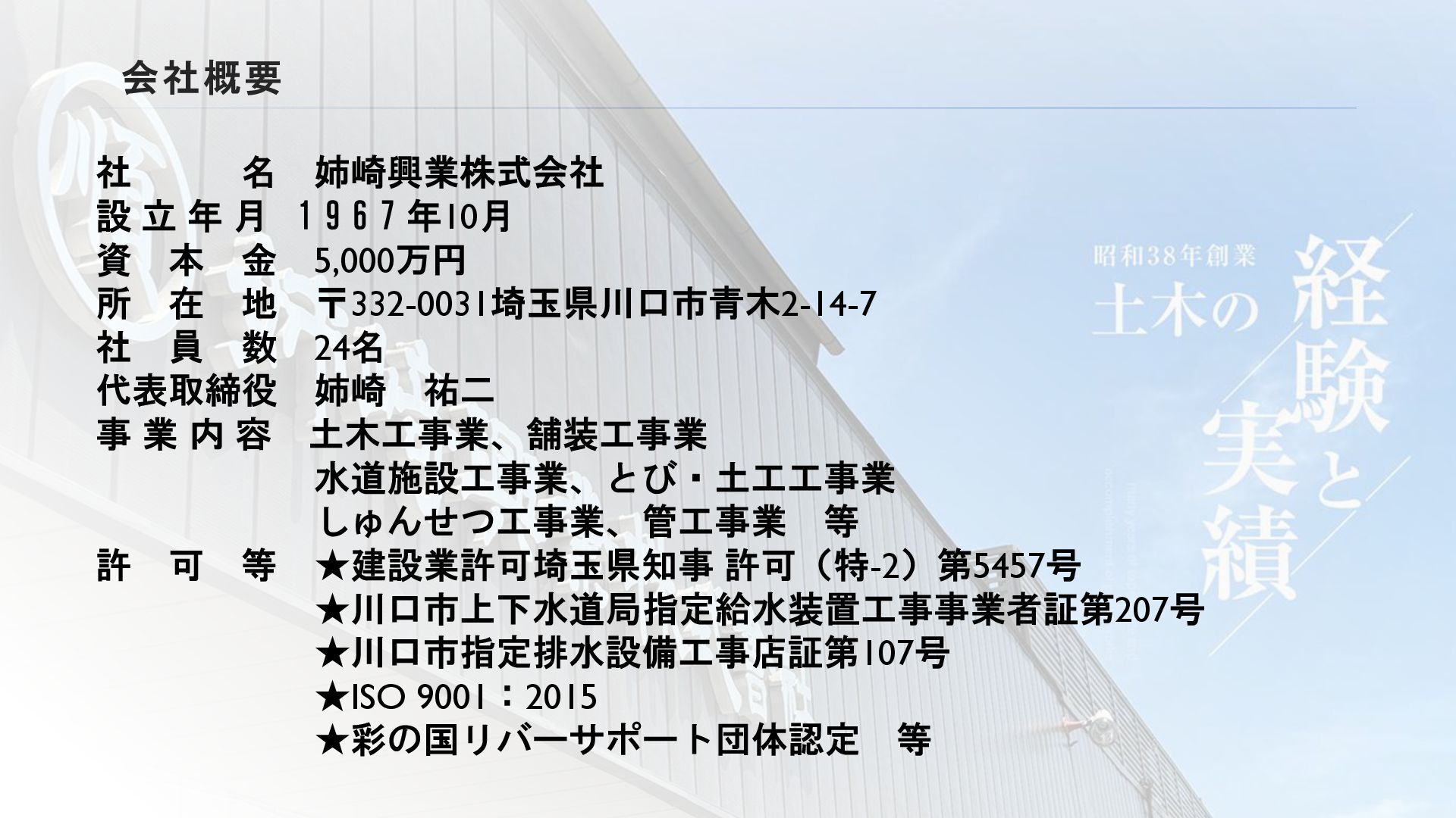6 7 年10月 資 本 金 5,000万円 所 在 地 〒332-0031埼玉県川口市青木2-14-7 社 員 数 24名 代表取締役 姉崎 祐二 事 業 内 容 土木工事業、舗装工事業 水道施設工事業、とび・土工工事業 しゅんせつ工事業、管工事業 等 許 可 等 ★建設業許可埼玉県知事 許可(特-2)第5457号 ★川口市上下水道局指定給水装置工事事業者証第207号 ★川口市指定排水設備工事店証第107号 ★ISO 9001:2015 ★彩の国リバーサポート団体認定 等