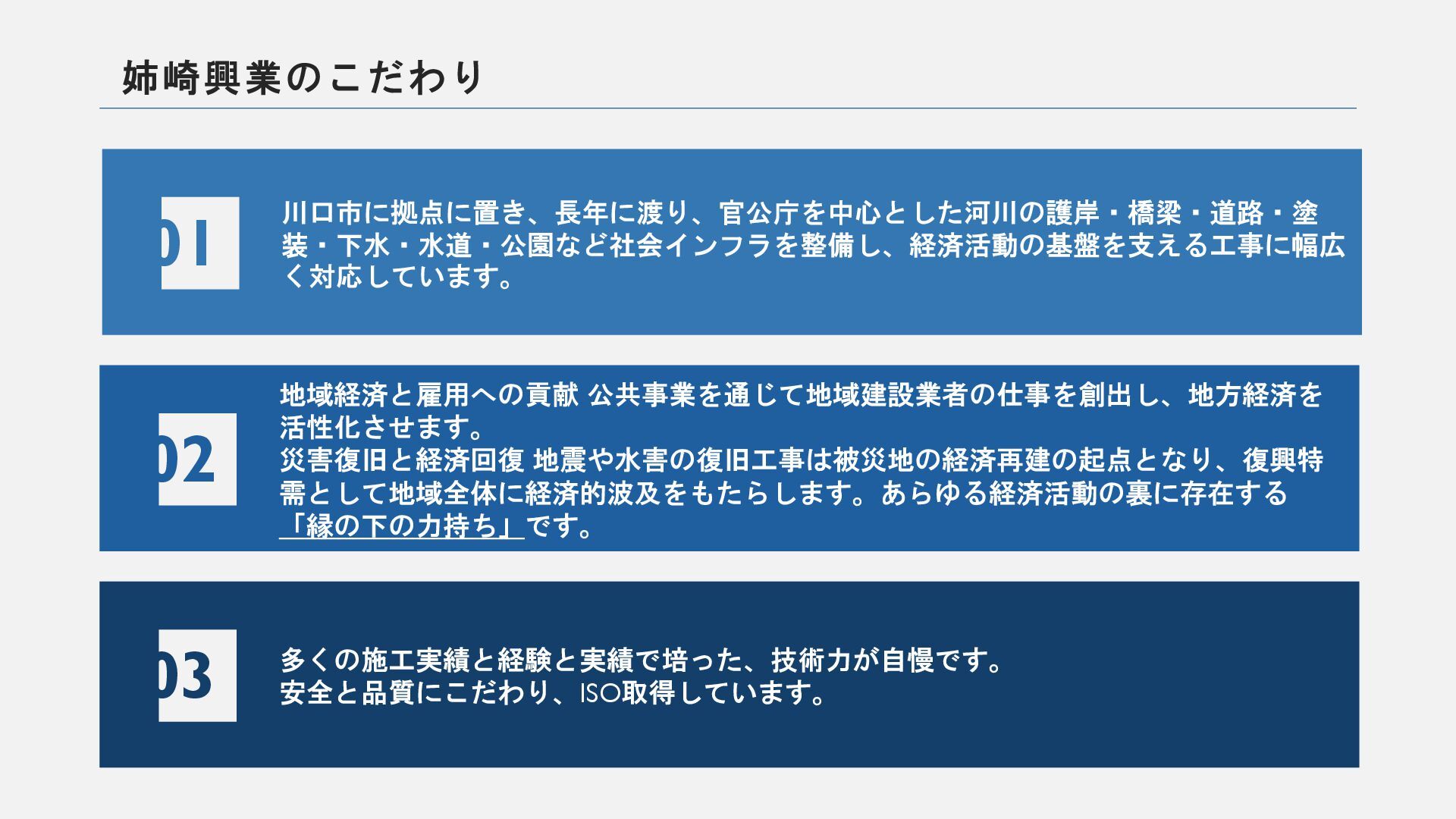 姉崎興業のこだわり 01 川口市に拠点に置き、長年に渡り、官公庁を中心とした河川の護岸・橋梁・道路・塗 装・下水・水道・公園など社会インフラを整備し、経済活動の基盤を支える工事に幅広 く対応しています。 02 地域経済と雇用への貢献 公共事業を通じて地域建設業者の仕事を創出し、地方経済を 活性化させます。 災害復旧と経済回復