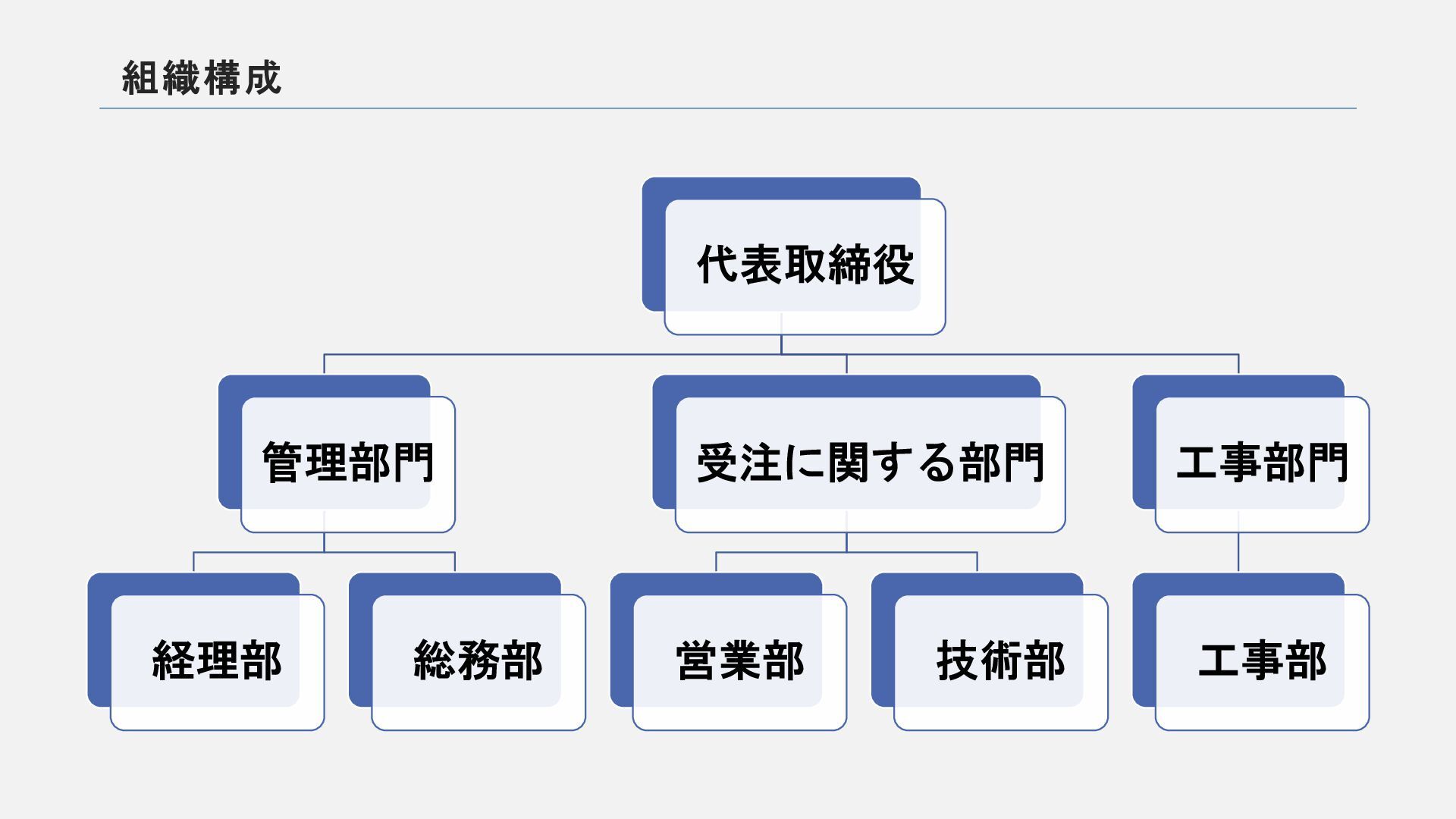 組織構成 代表取締役 管理部門 経理部 総務部 受注に関する部門 営業部 技術部 工事部門 工事部