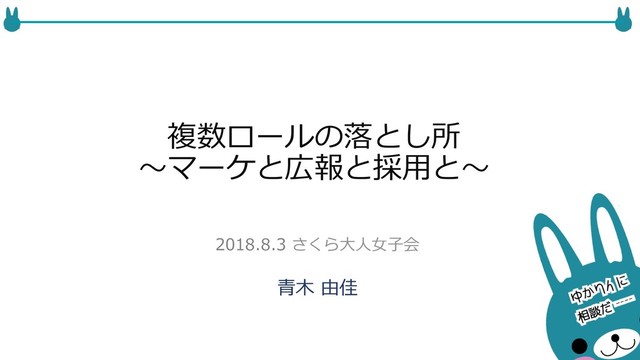 複数ロールの落落とし所 〜~マーケと広報と採⽤用と〜~ ⻘青⽊木 由佳 2018.8.3 さくら⼤大⼈人⼥女女⼦子会