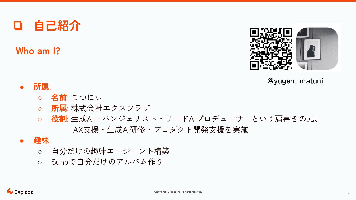 am I? • 所属: ◦ 名前: まつにぃ ◦ 所属: 株式会社エクスプラザ ◦ 役割: 生成AIエバンジェリスト・リードAIプロデューサーという肩書きの元、 AX支援・生成AI研修・プロダクト開発支援を実施 • 趣味 ◦ 自分だけの趣味エージェント構築 ◦ Sunoで自分だけのアルバム作り @yugen_matuni