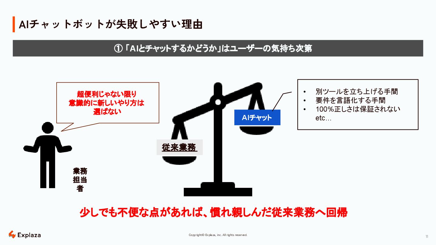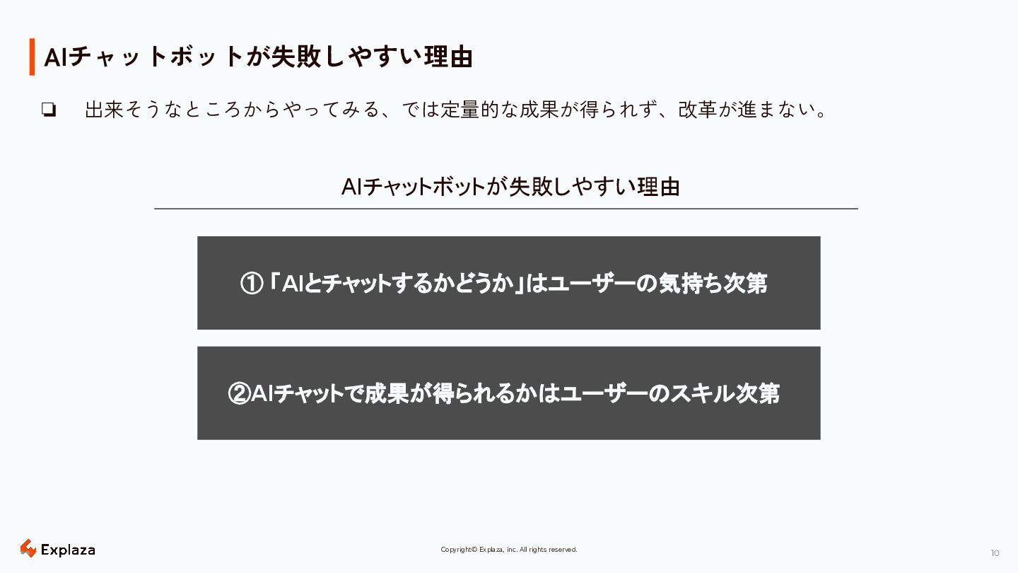 10 Copyright© Explaza, inc. All rights reserved. AIチャットボットが失敗しやすい理由 ❏ 出来そうなところからやってみる、では定量的な成果が得られず、改革が進まない。