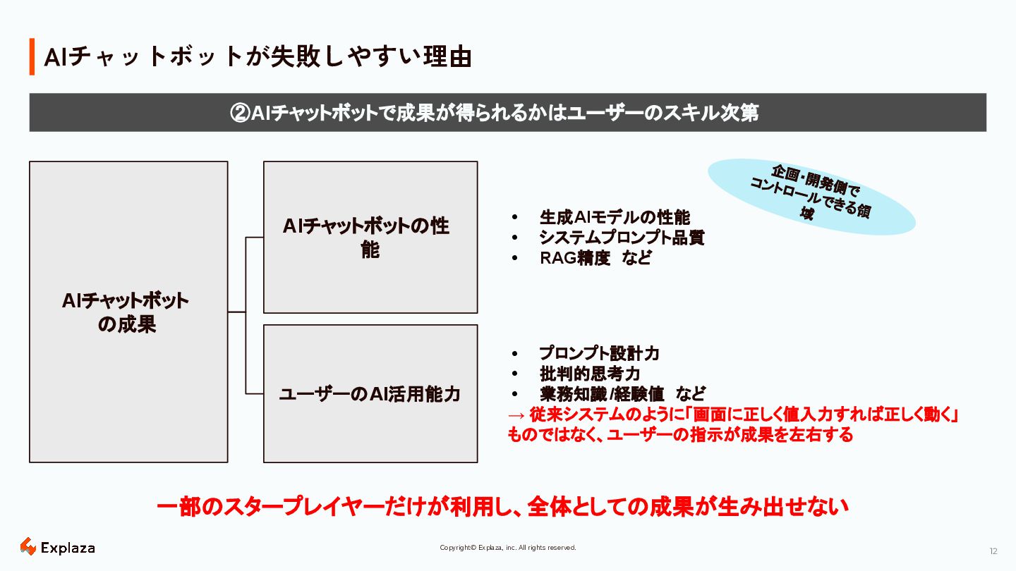 12 Copyright© Explaza, inc. All rights reserved. AIチャットボットが失敗しやすい理由 一部のスタープレイヤーだけが利用し、全体としての成果が生み出せない ②AIチャットボットで成果が得られるかはユーザーのスキル次第