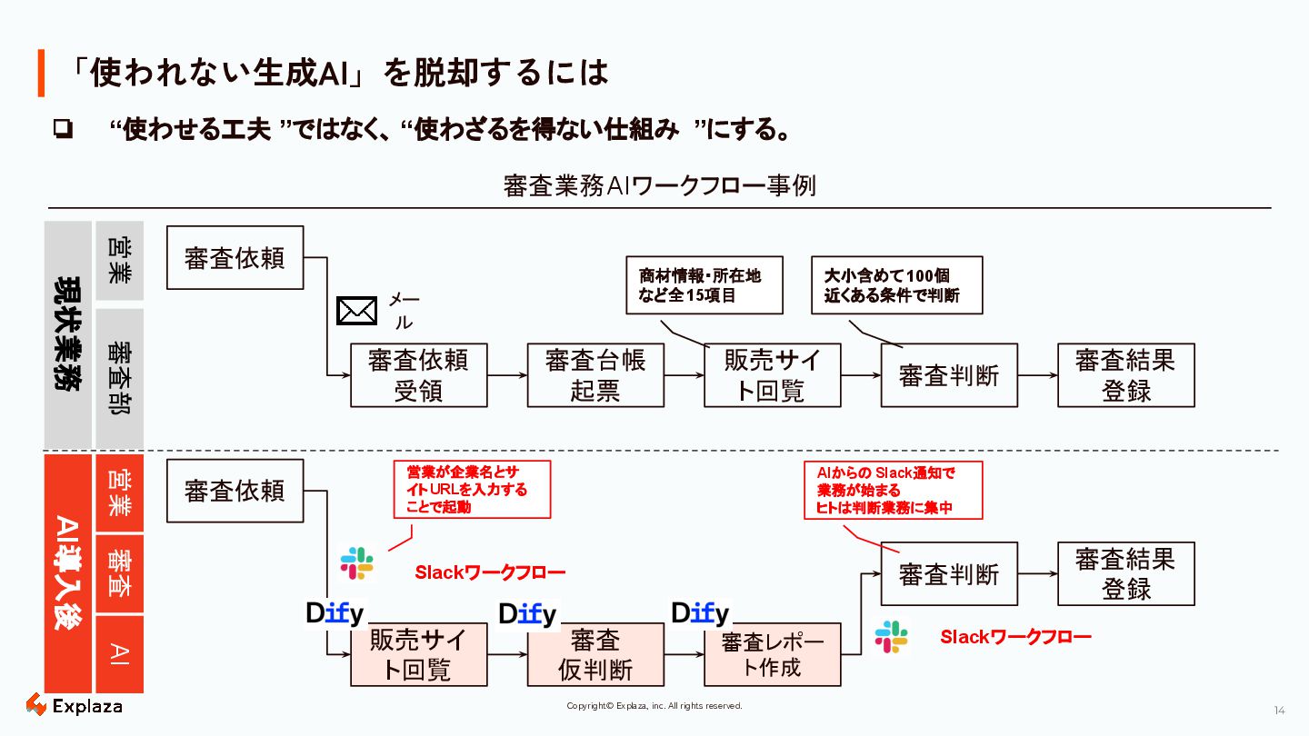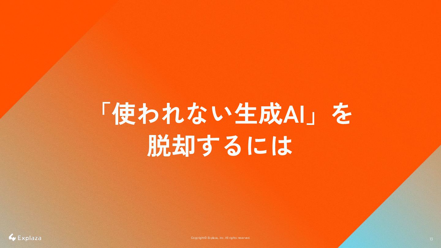 13 13 Copyright© Explaza, inc. All rights reserved. 「使われない生成AI」を 脱却するには