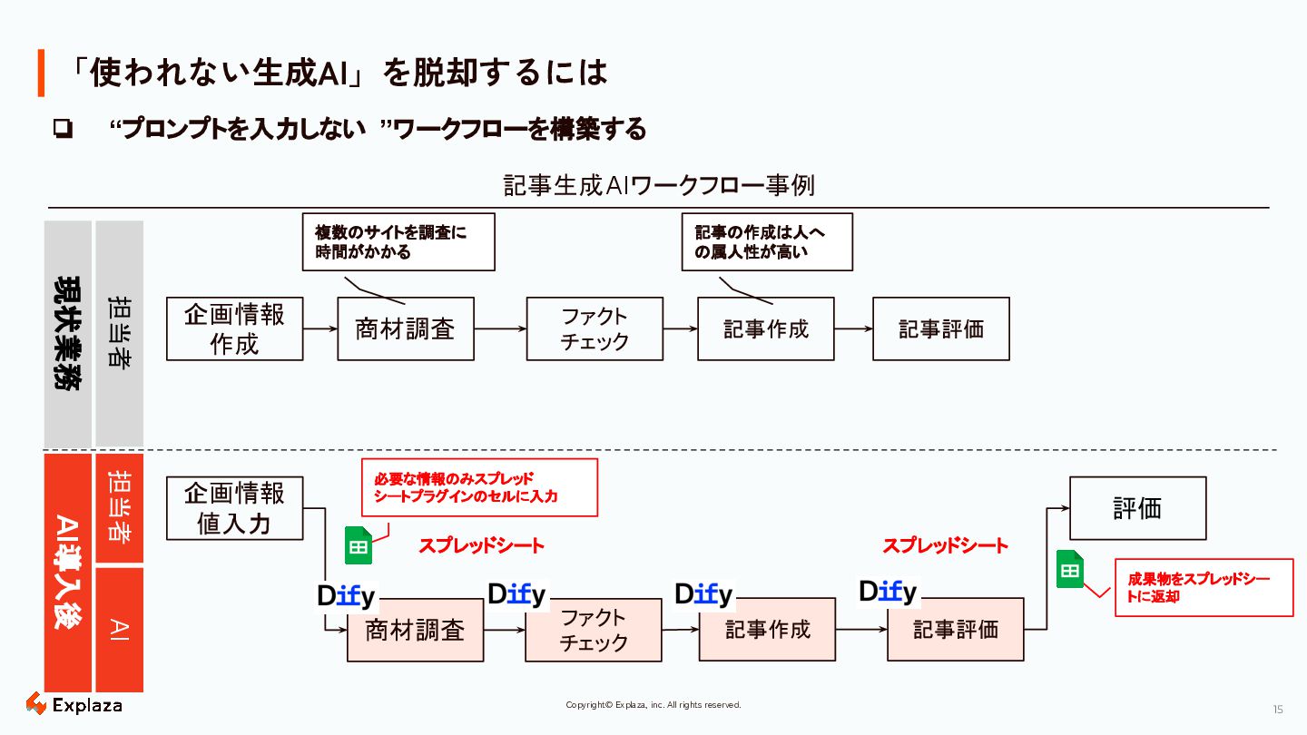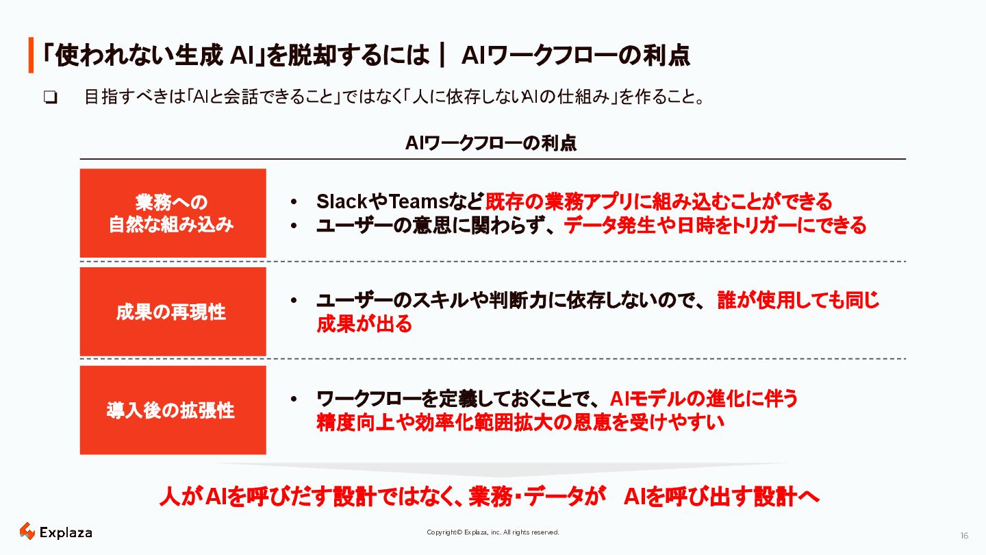 16 Copyright© Explaza, inc. All rights reserved. 「使われない生成 AI」を脱却するには| AIワークフローの利点