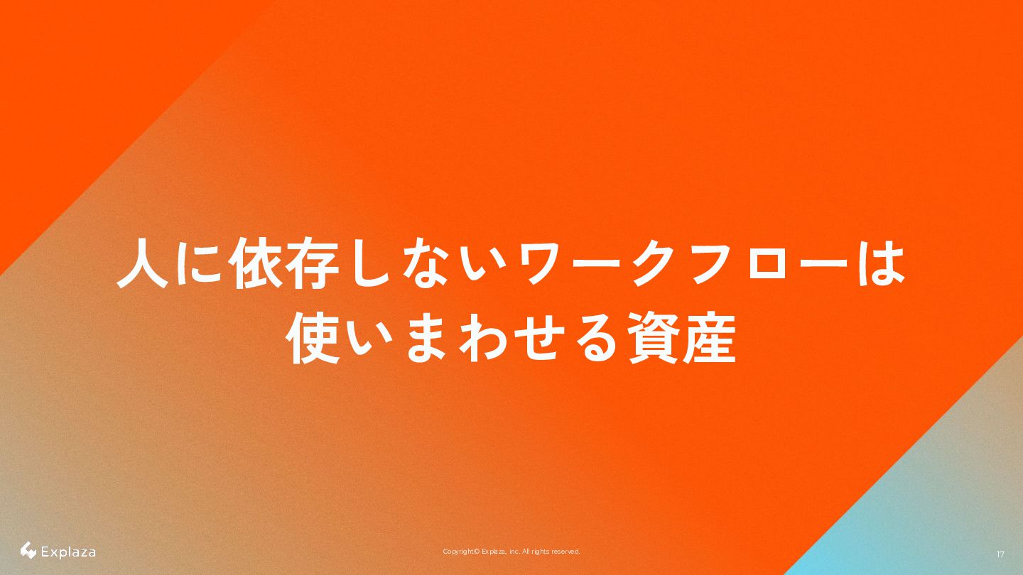 17 17 Copyright© Explaza, inc. All rights reserved. 人に依存しないワークフローは 使いまわせる資産