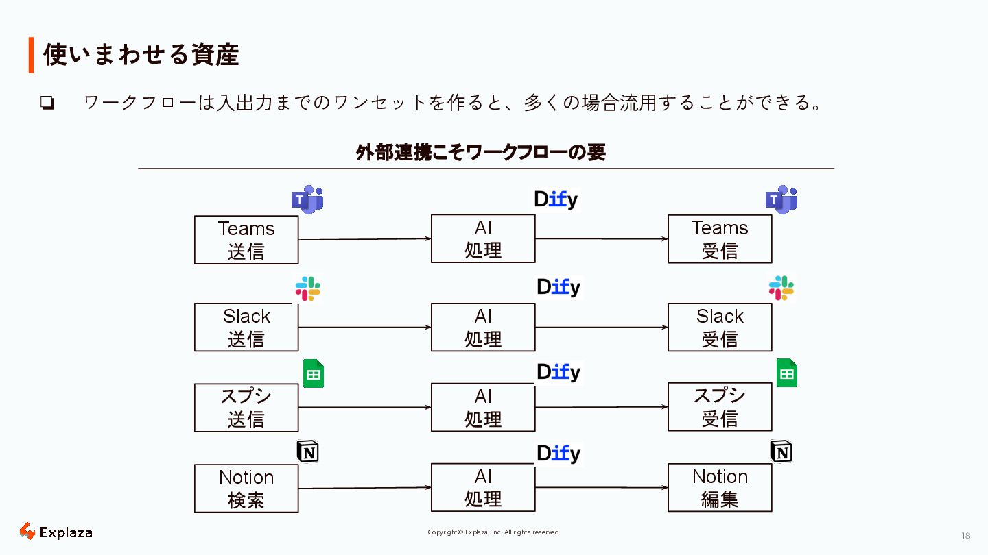 18 Copyright© Explaza, inc. All rights reserved. 使いまわせる資産 Slack 送信