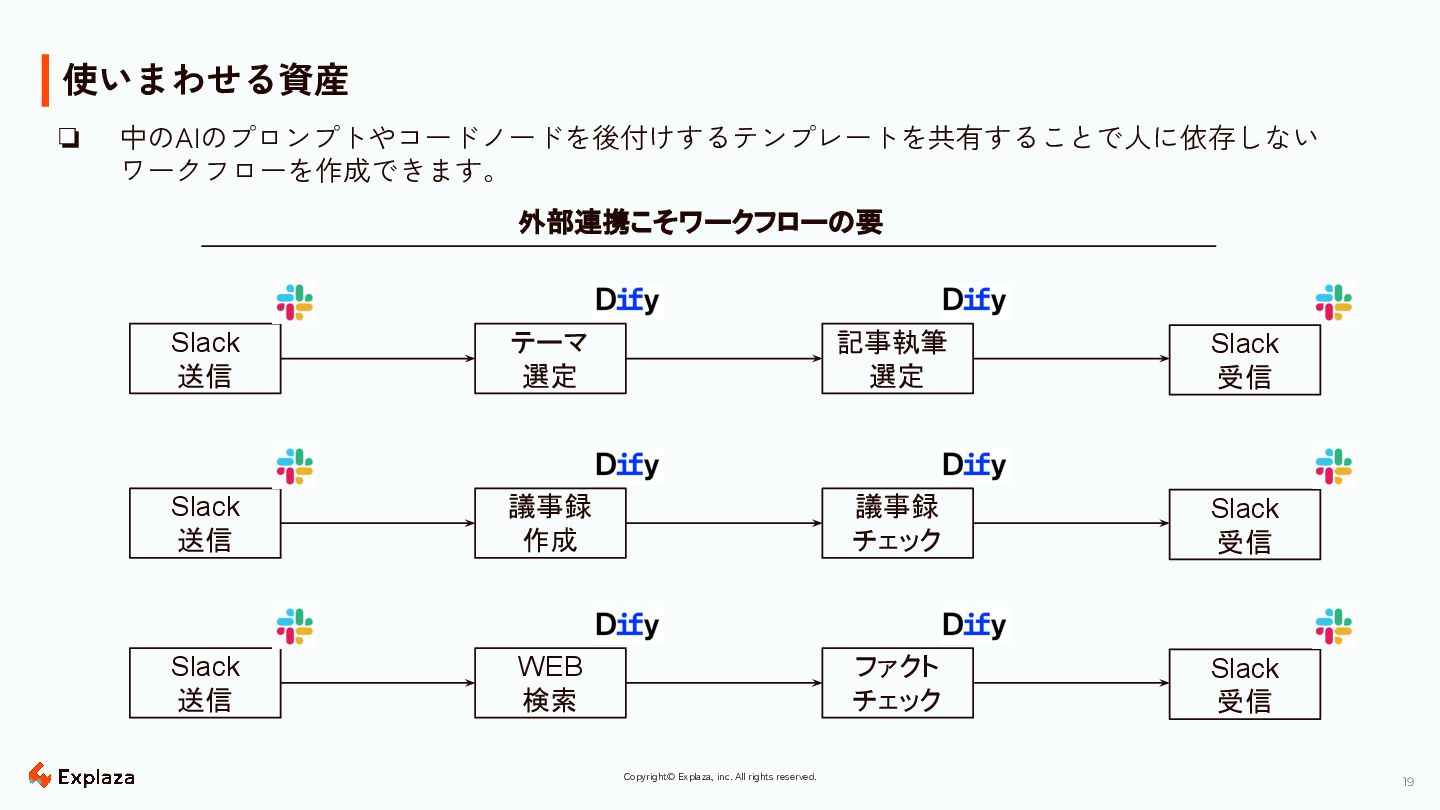 19 Copyright© Explaza, inc. All rights reserved. 使いまわせる資産 Slack 送信